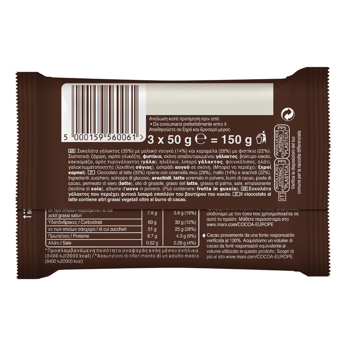 Σοκολάτα γάλακτος γεμιστή με μαλακό νουγκά, καραμέλα και φρεσκοψημένα φιστίκια, που σε χορταίνει... γιατί δεν είσαι ο εαυτός σου όταν πεινάς! Το ιδανικό snack για το γραφείο για να σου δώσει ενέργεια όταν το χρειάζεσαι.