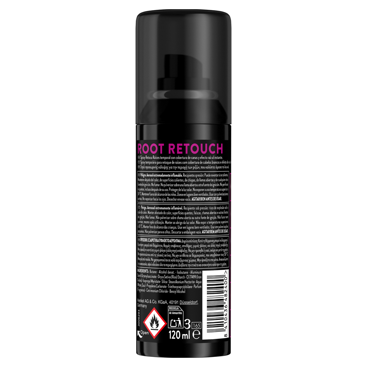Σπρέι προσωρινής κάλυψης για την περιοχή των ριζών, που καλύπτει άμεσα τα λευκά. Στεγνώνει γρήγορα και χαρίζει ένα ομοιόμορφο αποτέλεσμα χωρίς να δημιουργεί αντίθεση με το χρώμα των μαλλιών σας. Η μεγάλης ακρίβειας βαλβίδα ψεκασμού επιτρέπει την εφαρμογή μόνο στα σημεία που χρειάζεται. Διαρκεί μέχρι το επόμενο λούσιμο. Ποσότητα επαρκής για έως και 40 εφαρμογές. Εφαρμογή: Ανακινήστε καλά πριν τη χρήση. Καλύψτε τους ώμους σας με μια πετσέτα. Ψεκάστε κρατώντας το μπουκάλι σε όρθια θέση ασκώντας απαλή πίεση. Εφαρμόστε ομοιόμορφα σε στεγνές και χτενισμένες ρίζες, ψεκάζοντας απαλά από απόσταση 10 εκ. Χρησιμοποιήστε το σε μικρή ποσότητα. Η υπερβολική ποσότητα μπορεί να προκαλέσει τριβή. Κατάλληλο για καθημερινή χρήση ανάμεσα στις βαφές.
