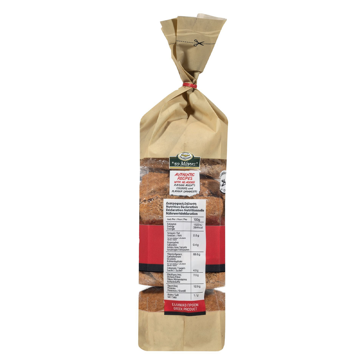 Ο παραδοσιακός Κρητικός Ντάκος. Το πιο διάσημο πιάτο της Κρήτης που μπορείτε να το συνοδεύσετε με ντομάτα, τυρί, ελαιόλαδο, ρίγανη. Αγνή Κριθαροκουλούρα, διπλοφουρνιστή, με φυσική γεύση: Προϊόν χαμηλό σε λιπαρά και πλούσιο σε φυτικές ίνες με άριστη γεύση, χωρίς χρήση πρόσθετων βελτιωτικών γεύσης, ζάχαρης, πρόσθετων κορεσμένων λιπαρών και τεχνητών αρωμάτων. Μια μερίδα προϊόντος έχει αναλογικά τη μισή ποσότητα αλατιού από μια μερίδα ψωμί.