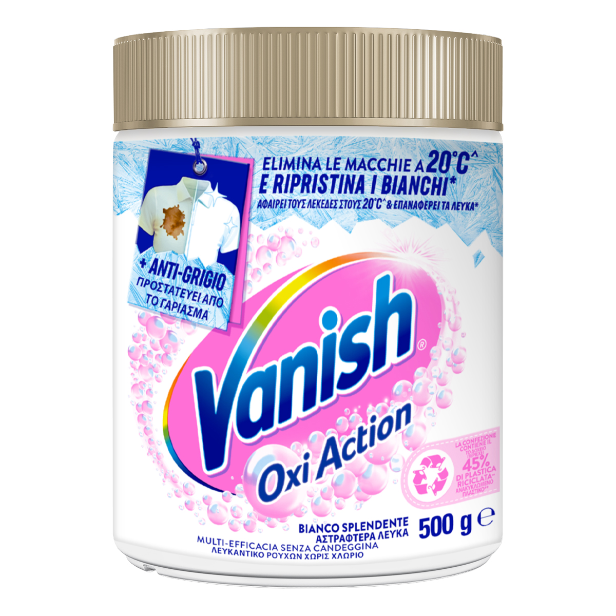 Η εκπληκτική Oxi Action σύνθεση απελευθερώνει εκατομμύρια φυσαλίδες οξυγόνου. Η σύνθεσή του δεν περιέχει χλώριο. Είναι ειδικά σχεδιασμένο για να κάνει τα λευκά σας λευκότερα και είναι ασφαλές για καθημερινά υφάσματα όπως βαμβακερά και πολυεστερικά. Είναι αποτελεσματικό ακόμα και σε κρύο νερό. Ενισχυτικό πλύσης σε μορφή σκόνης Λευκαντικό ρούχων χωρίς χλώριο.