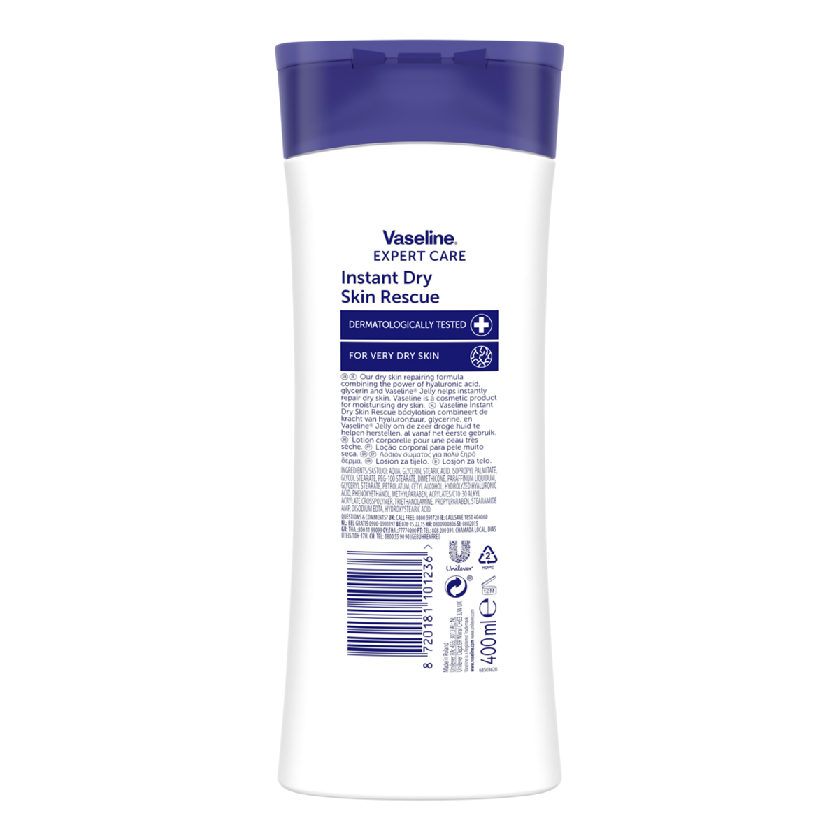 Vaseline Λοσιόν Σώματος για Ξηρές Επιδερμίδες 400ml. Η ενυδατική λοσιόν σώματος Vaseline Instant Dry Skin Rescue, βοηθά στην επανόρθωση της ξηρής επιδερμίδας από την 1η χρήση. Η σύνθεση της με υαλουρονικό οξύ, ενυδατική γλυκερίνη και μικρο-σταγονίδια Vaseline Petroleum Jelly, ενυδατώνει και απορροφάται σε δευτερόλεπτα αφήνοντας το δέρμα πιο απαλό. Δερματολογικά ελεγμένη, χωρίς άρωμα και χωρίς να αφήνει ίχνη λιπαρότητας.