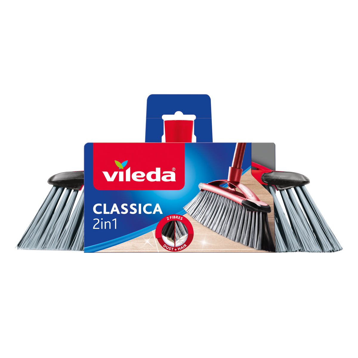 Η Vileda Classica σκούπα 2σε1 συνδυάζει δύο τύπους ινών. Οι πυκνές και λεπτές τρίχες (μαύρες) για την συλλογή της λεπτής σκόνης. Οι σκληρές τρίχες (ασημί) για την συλλογή σωματιδίων και τριχών. Διαθέτει προστατευτικά στις άκρες για να μην "τραυματίζει" τα έπιπλα σας. Οι τρίχες της είναι κατασκευασμένες από ανακυκλώσιμο PET, συνεισφέροντας έτσι στην προστασία του περιβάλλοντος.