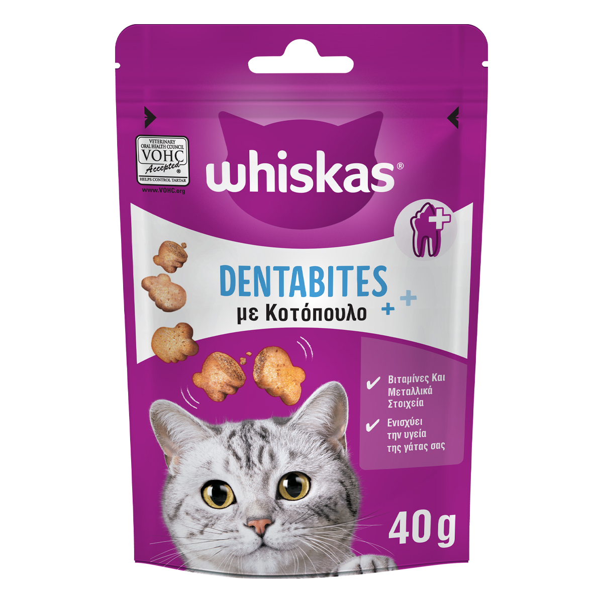 WHISKAS® Dentabites υγιεινές λιχουδιές για τα δόντια της γάτας 40g. Το WHISKAS® DentaBites είναι κλινικά αποδεδειγμένο ότι μειώνει το σχηματισμό της πέτρας στα δόντια της γάτας. Λόγω του ειδικού σχήματός του και της υφής του, όταν προσφέρεται καθημερινά, το WHISKAS® DentaBites βοηθά να φροντίζετε τα δόντια της γάτας σας. Συμπληρωματική τροφή για ενήλικες γάτες.