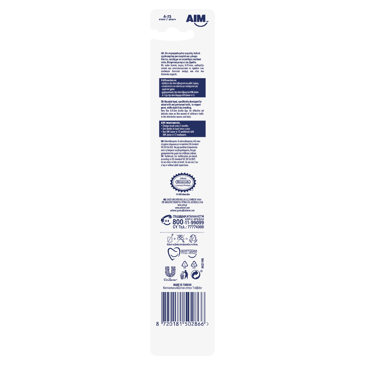 Νέα AIM Junior 6-13 ετών, πολύ μαλακή, σχεδιασμένη για τα νεογιλά και μόνιμα δόντια, με βεντούζα. Με στρογγυλεμένη κεφαλή. Ειδικά σχεδιασμένη για νεογιλά και μόνιμα δόντια, απαλή με τα ευαίσθητα παιδικά ούλα.Βούρτσισμα πρωί και βράδυ. Με πολύ λεπτές άκρες 0.01mm, καθαρίζει απαλά και αποτελεσματικά το σμάλτο των παιδικών δοντιών ακόμη και στα πιο δύσκολα σημεία.