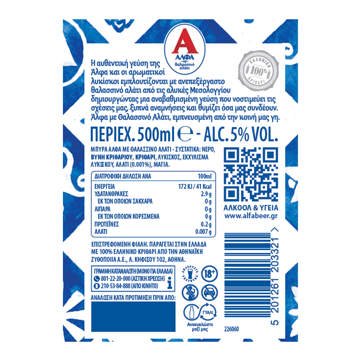 Η αυθεντική γεύση της ΑΛΦΑ και οι αρωματικοί λυκίσκοι συναντούν μια μικρή ποσότητα ανεπεξέργαστου θαλασσινού αλατιού από τις αλυκές Μεσολογγίου, δημιουργώντας μια αναβαθμισμένη γεύση που ξυπνά αναμνήσεις και θυμίζει όσα μας συνδέουν. Μια χρυσαφένια, δροσιστική και ευκολόπιοτη lager, έρχεται να μας προσφέρει μια αναπάντεχη γευστική εμπειρία.