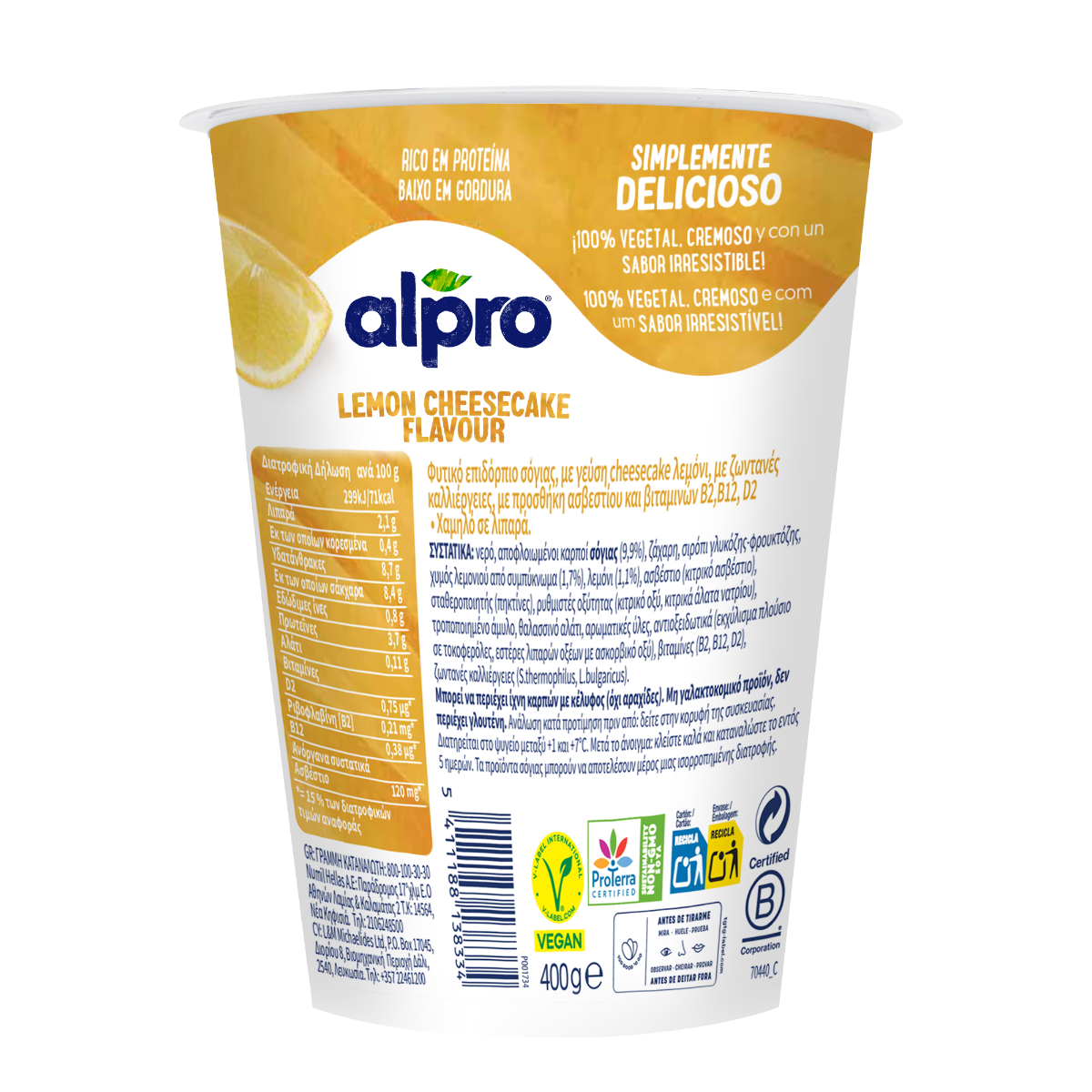 Φυτικό επιδόρπιο σόγιας,με γεύση cheesecake λεμόνι, με ζωντανές καλλιέργειες, με προσθήκη ασβεστίου και βιταμινών B2, B12,D2.