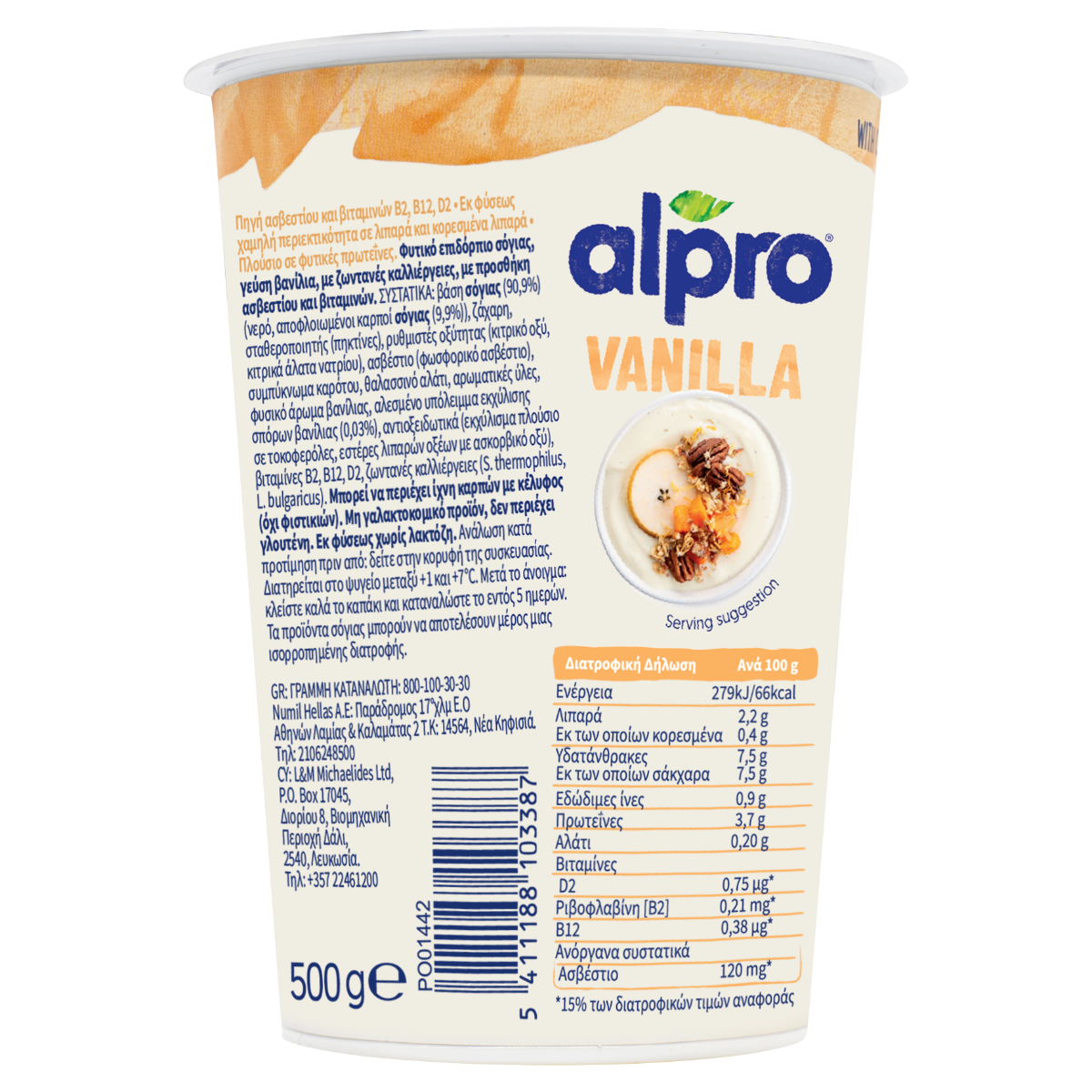 Φυτικό επιδόρπιο σόγιας, γεύση βανίλια, με ζωντανές καλλιέργειες, με προσθήκη ασβεστίου και βιταμινών. NEA Φυτικά επιδόρπια Alpro με ζωντανές καλλιέργειες! Η βανίλια είναι ίσως η πιό κλασική και αγαπημένη γεύση. Επίσης, είναι γεμάτη με φυτική πρωτεΐνη υψηλής ποιότητας. Απόλαυσε την απαλή του υφή και γεύση με άρωμα βανίλιας που θα σε ταξιδέψει. Σκέτο ή σε συνδυασμό με τα αγαπημένα σου toppings. Μόνο μια δοκιμή θα σε πείσει. Πλούσιο σε φυτικές πρωτεΐνες. Πηγή ασβεστίου και βιταμινών Β2, Β12 & D. Το ασβέστιο απαιτείται για τη διατήρηση της φυσιολογικής κατάστασης των οστών, στα πλαίσια μιας ισορροπημένης διατροφής.