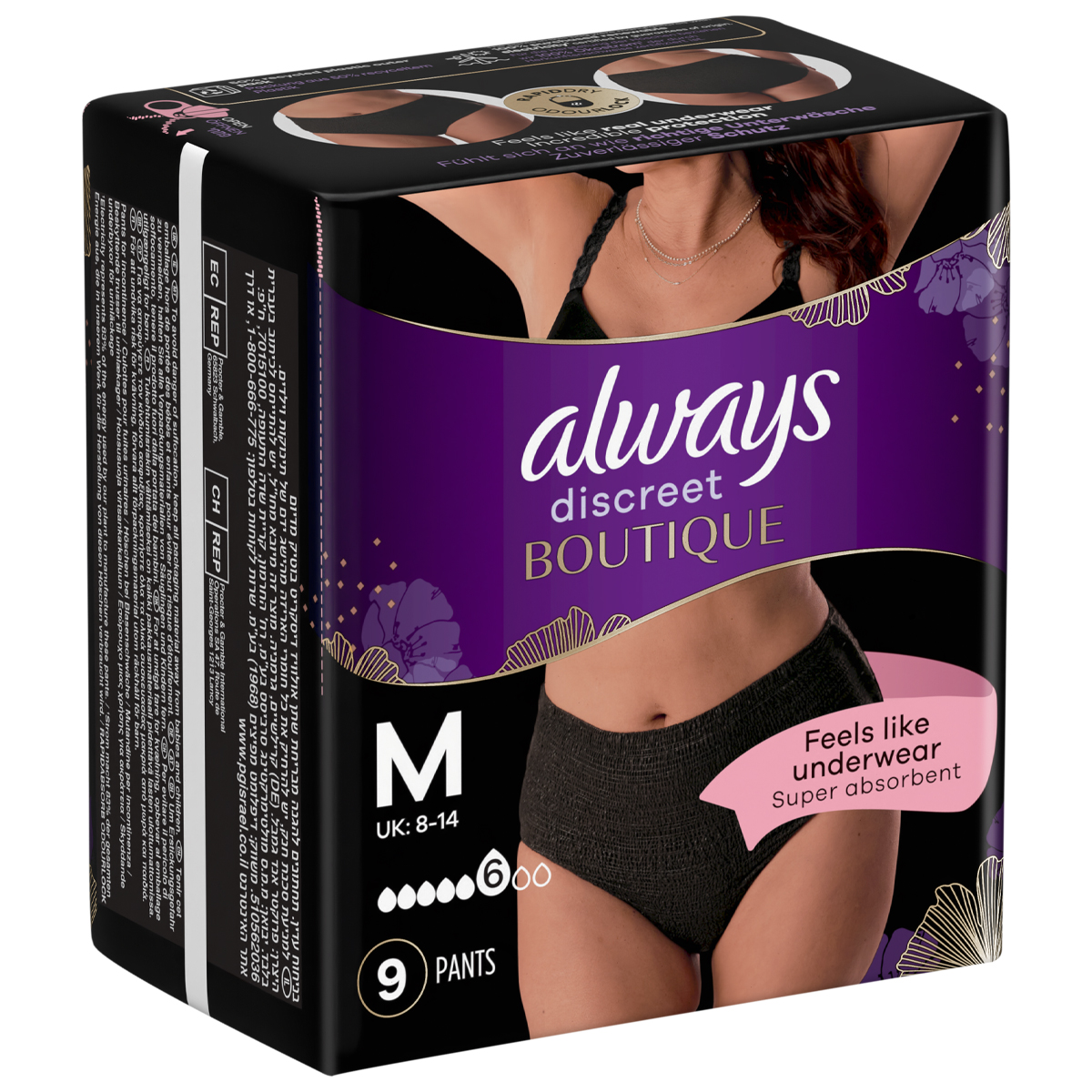 With Always Discreet Boutique incontinence underwear in black, incontinence will never again prevent you from living life to the fullest. Discover exceptional incontinence protection that fits your underwear thanks to their fabric-like material. The hidden super-absorbent core turns fluids into gel and locks in moisture instantly, so you feel fresh and secure every time. With a feminine, curve-hugging design, these panties are made from soft silk-like fabric that feels, fits and looks just like your regular underwear. Always Discreet Boutique allow you to walk with confidence and eliminate the problem of incontinence.
