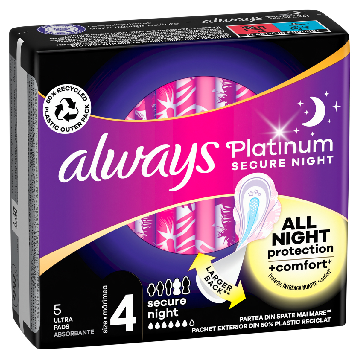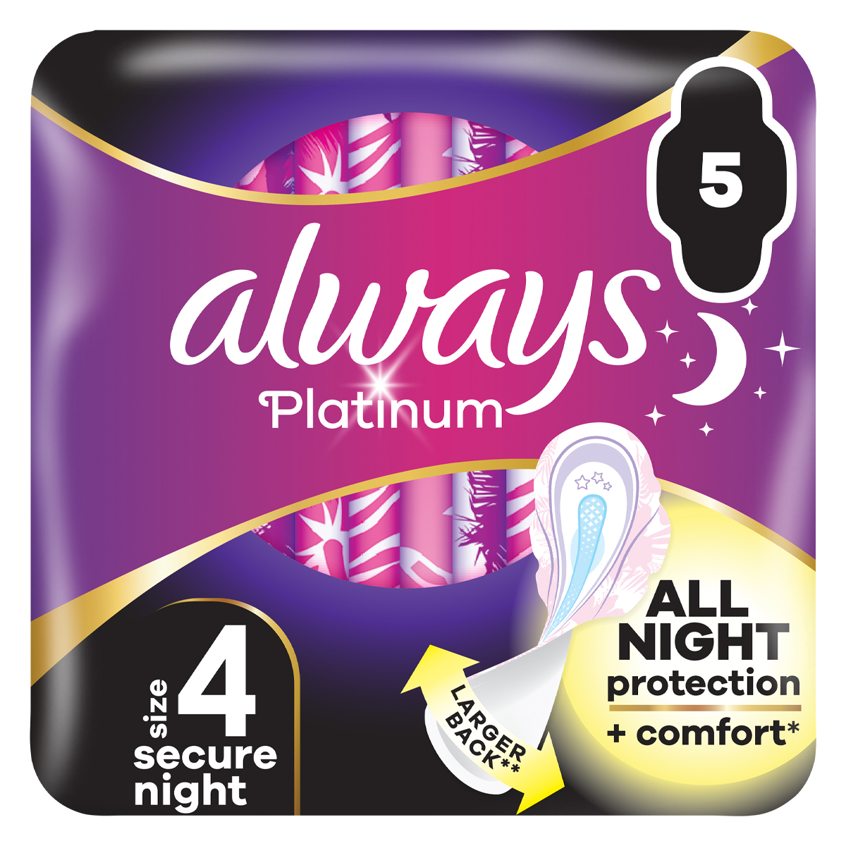 Always Platinum pads are designed to give you zero spills, zero movement and ultimate comfort. With Always Platinum pads you can continue to dream without worry. Always Platinum Secure Night (Size 4) have a 60%* larger back, for more protection in the moments you need it most. *compared to Always Platinum Normal (Size 1).