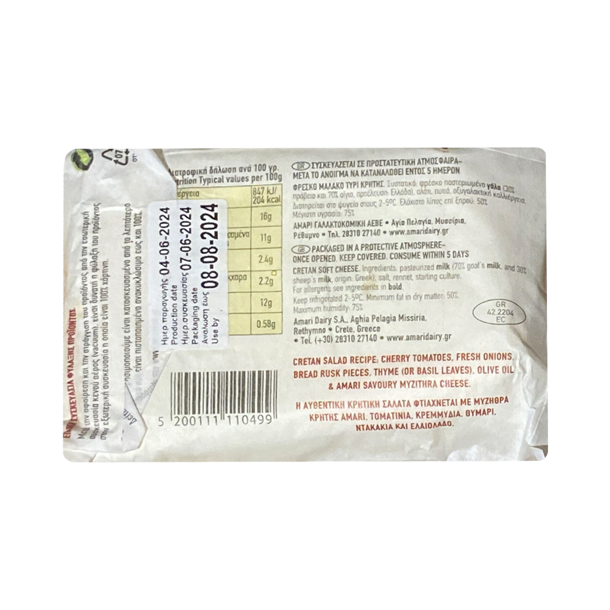 Creamy, airy and light, created from goat's milk in a ratio of 25% (sheep's milk) - 75% (goat's milk), produced immediately after pasteurization of the milk, placed in special containers for 1 day, hanging in bags to eliminate its liquids and packaged in just 3 days from production!