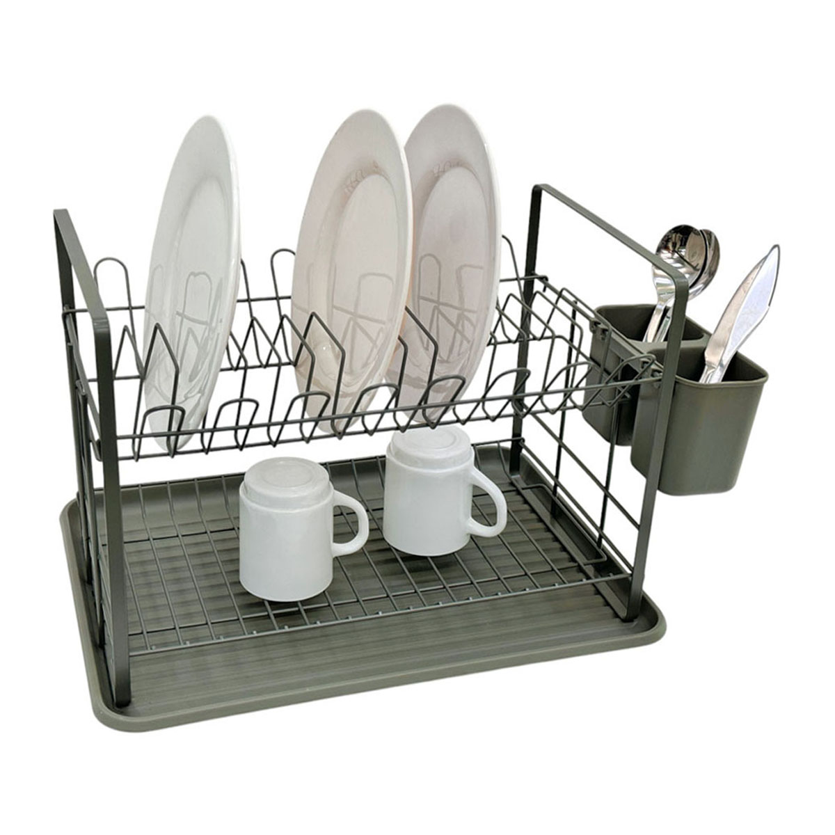 Πιατοθήκη διώροφη μεταλλική η οποία διαθέτει πλαστικό δίσκο και κουταλοθήκη σε λαδί ματ χρώμα. Καθαρίζεται εύκολα και διαθέτει ευρύχωρους χώρους για αποθήκευση πιάτων και σκευών. Ιδανική για καθημερινή χρήση.