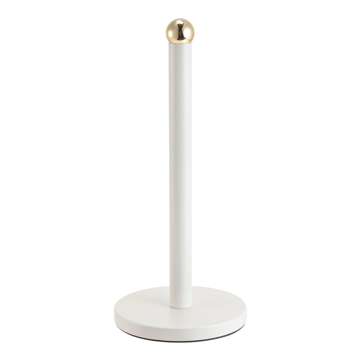 Μεταλλική βάση για χαρτί κουζίνας με σταθερή στρογγυλή βάση και λιτό, μοντέρνο σχεδιασμό, σε λευκό ματ χρώμα με διακριτική χρυσή λεπτομέρεια στο επάνω μέρος. Ιδανική για εύκολη χρήση και τακτοποιημένο πάγκο κουζίνας.
