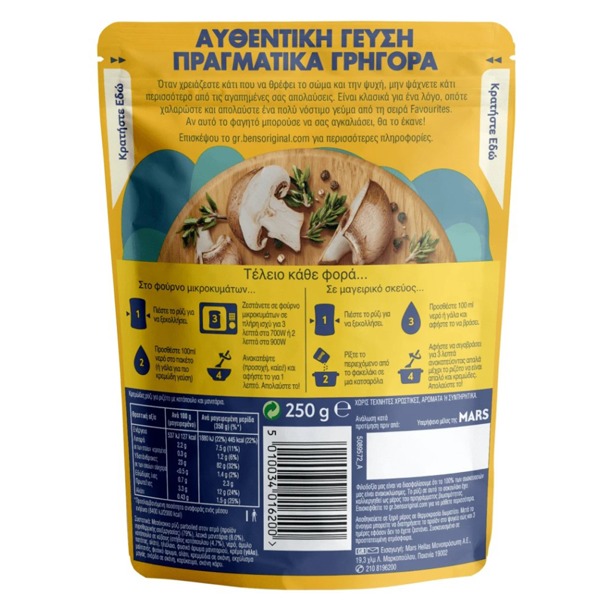 Μεσόκοκκο ρύζι parboiled στον ατμό (προϊόν υγροθερμικής επεξεργασίας) (79%), λευκά μανιτάρια (8.0%), κοτόπουλο σε κύβους (στήθος κοτόπουλου (4,7%), νερό, άμυλο πατάτας, αλάτι), ηλιέλαιο, φυσικό άρωμα μανιταριού, κρέμα(ΓΑΛΑ), μαϊντανός, φυσικό άρωμα, αλάτι, κρεμμύδια σε σκόνη, εκχύλισμα μαγιάς, σκόρδο σε σκόνη, καρυκεύματα, σκόνη κάρυ.
