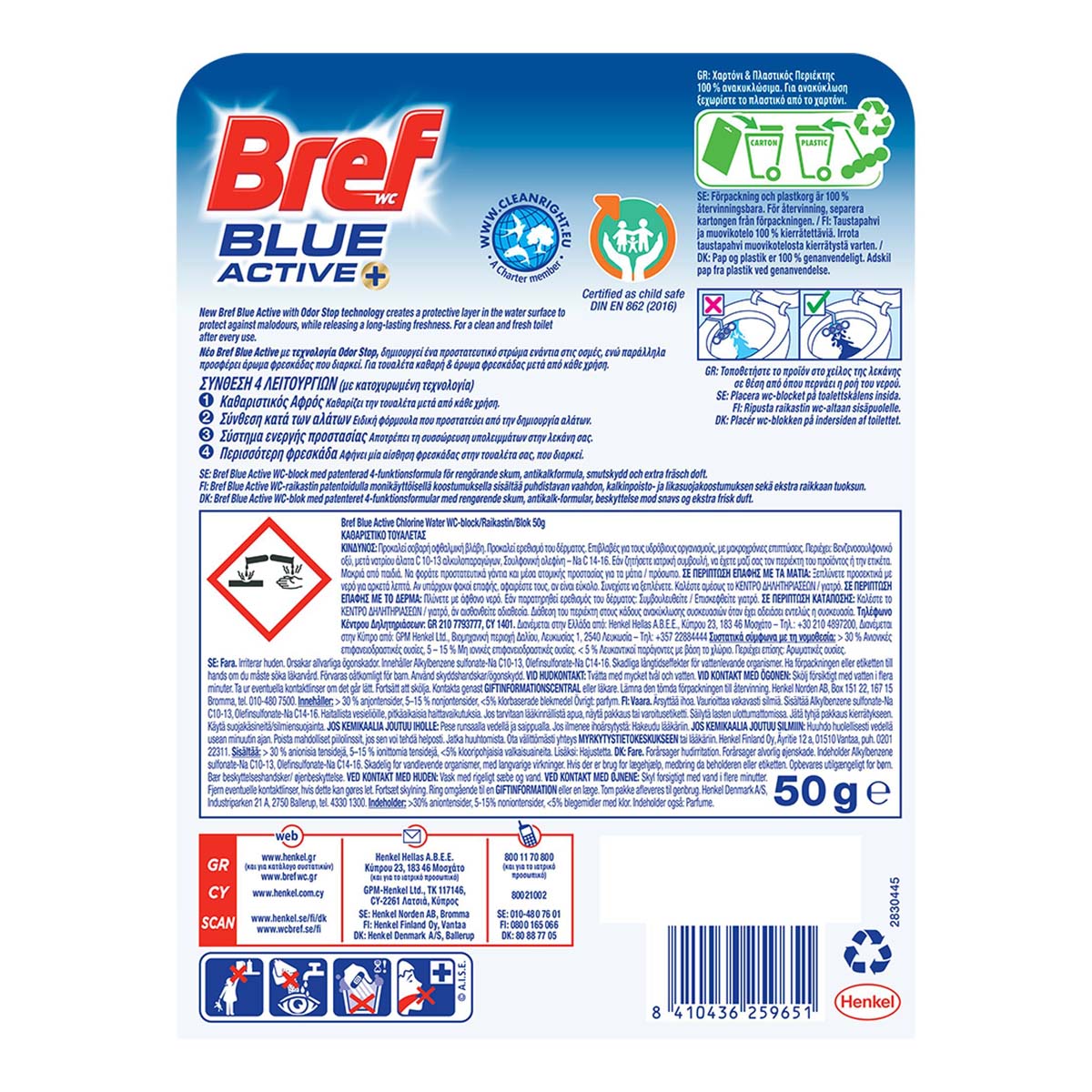 The power of blue water in the toilet! The Bref Blue Activ toilet block has come to offer a new dimension in toilet hygiene. Thanks to its active ingredients, it keeps your toilet clean and full of freshness even when not in use. How? As soon as you press the flush, the flush holder collects water, enriches it with its active ingredients and releases it. The blue water stays in your toilet and cleans it until the next use! Moreover, enriched with the successful 4-function formula of Power Active, Bref Blue Activ prevents the formation of salts, releases cleaning foam, provides an active protection system, preventing the accumulation of residues and offers more freshness.