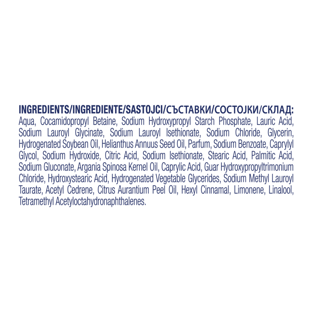 Aqua, Cocamidopropyl Betaine, Sodium Hydroxypropyl Starch Phosphate, Lauric Acid, Sodium Lauroyl Glycinate, Sodium Lauroyl Isethionate, Sodium Chloride, Glycerin, Hydrogenated Soybean Oil, Helianthus Annuus Seed Oil, Parfum, Sodium Benzoate, Caprylyl Glycol, Sodium Hydroxide, Citric Acid, Sodium Isethionate, Stearic Acid, Palmitic Acid, Sodium Gluconate, Argania Spinosa Kernel Oil, Caprylic Acid, Guar Hydroxypropyltrimonium Chloride, Hydrostearic Acid, Hydrogenated Vegetable Glycerides, Sodium Methyl Lauroyl Taurate, Hexyl Cinnamal, Limonene, Linalool.