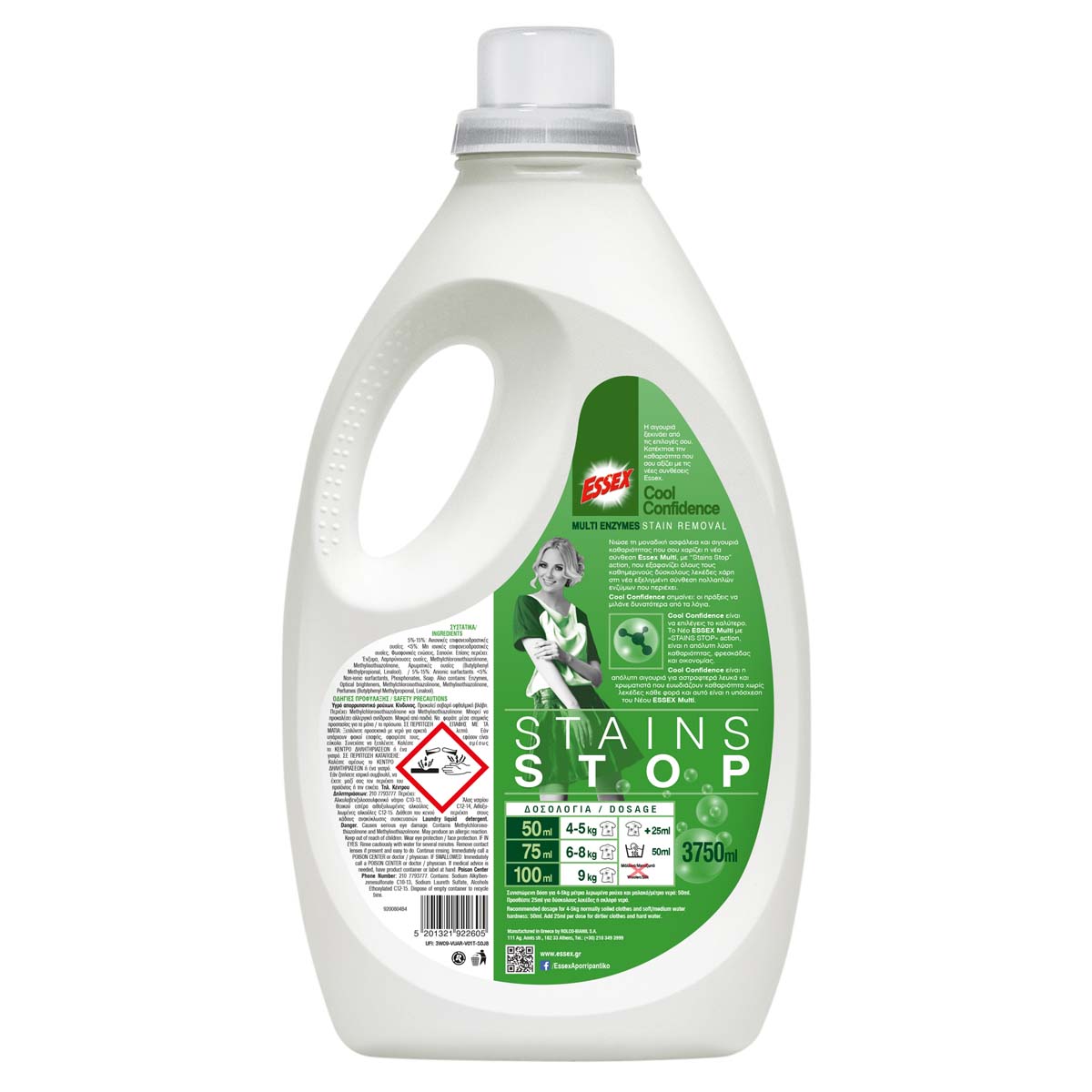 Thanks to its advanced multi-enzyme and active oxygen formula, New Essex Multi fights all everyday, stubborn stains. New ESSEX Multi, thanks to its "STAINS STOP" active formula, is the ultimate solution for cleanliness, freshness and economy. Cool Confidence is the ultimate confidence for sparkling white and coloured clothes without stains, smelling of cleanliness every time! That is the promise of the new ESSEX Multi.