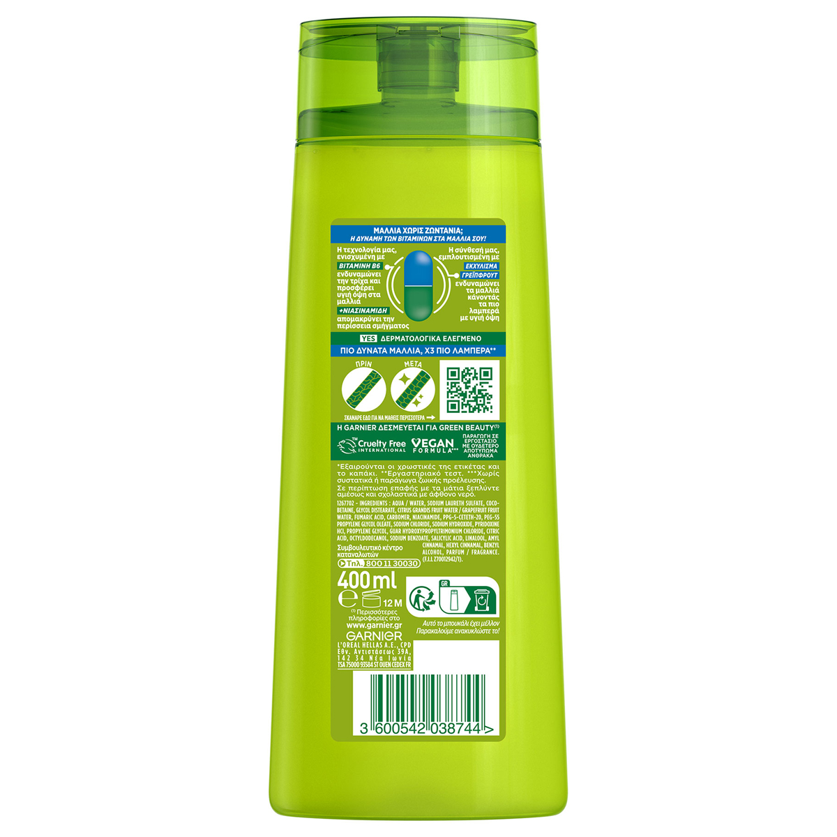 The power of vitamins in your hair! Hair without vitality? Discover the new Fructis Strength & Shine formula. Its new Technology is enhanced with: Vitamin B6, which strengthens the hair and provides a healthy look to the hair. Niacinamide, which removes excess sebum. Its formula, enriched with Grapefruit Extract, strengthens the hair making it shinier with a healthy look. Proven Effectiveness! Hair stronger, X3 shinier.