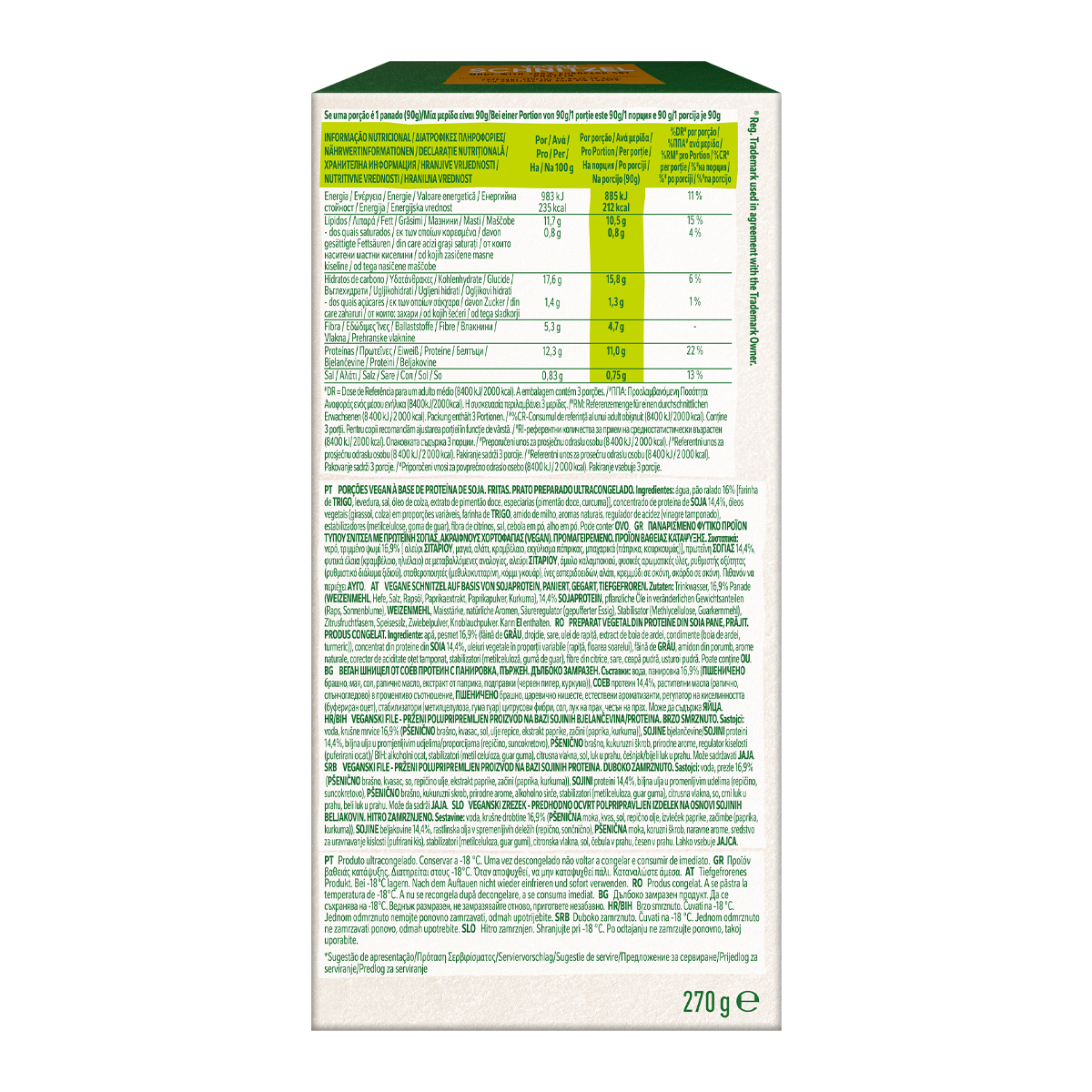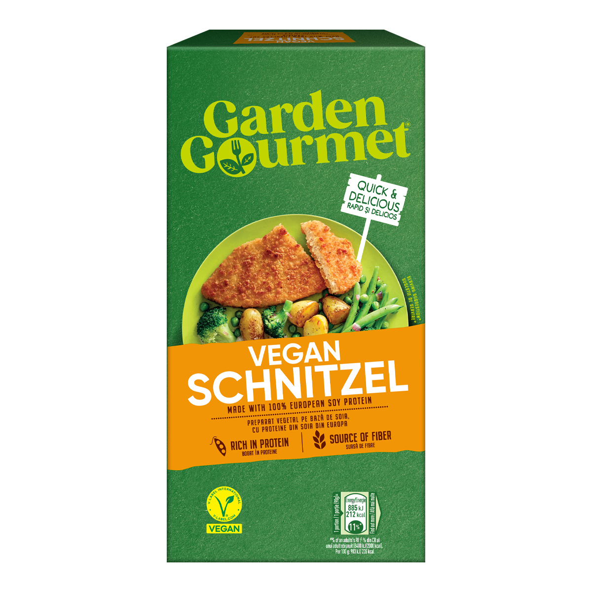 Breaded vegetable product type schnitzel with WINE protein. GARDEN GOURMET Vegan Schnitzel. Garden Gourmet is made with plant-based ingredients and is a delicious choice for those seeking an alternative diet. It has the familiar Schnitzel taste, but without the meat and is very easy to prepare. Its delicious taste will delight young and old alike!