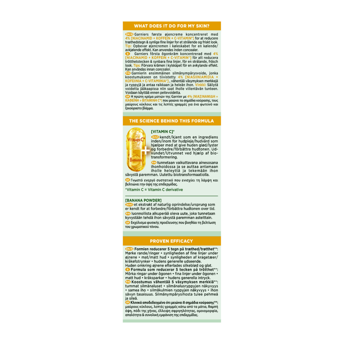 Η πρώτη κρέμα ματιών της Garnier με 4% (ΝΙΑΣΙΝΑΜΙΔΗ + ΚΑΦΕΪΝΗ + ΒΙΤΑΜΙΝΗ C* + BANANA POWDER) που μειώνει 8 σημάδια κούρασης: τους μαύρους κύκλους, τις λεπτές γραμμές, την θαμπή όψη, τις ρυτίδες στο πόδι της χήνας, την έλλειψη σφριγηλότητας & την ανομοιομορφία για ένα φωτεινό και ξεκούραστο βλέμμα. Προσφέρει απαλότητα & βελτιώνει την συνολική εμφάνιση της επιδερμίδας. Λαμπερή κίτρινη σύνθεση χωρίς άρωμα, κατάλληλο για χρήση πριν την εφαρμογή concealer.