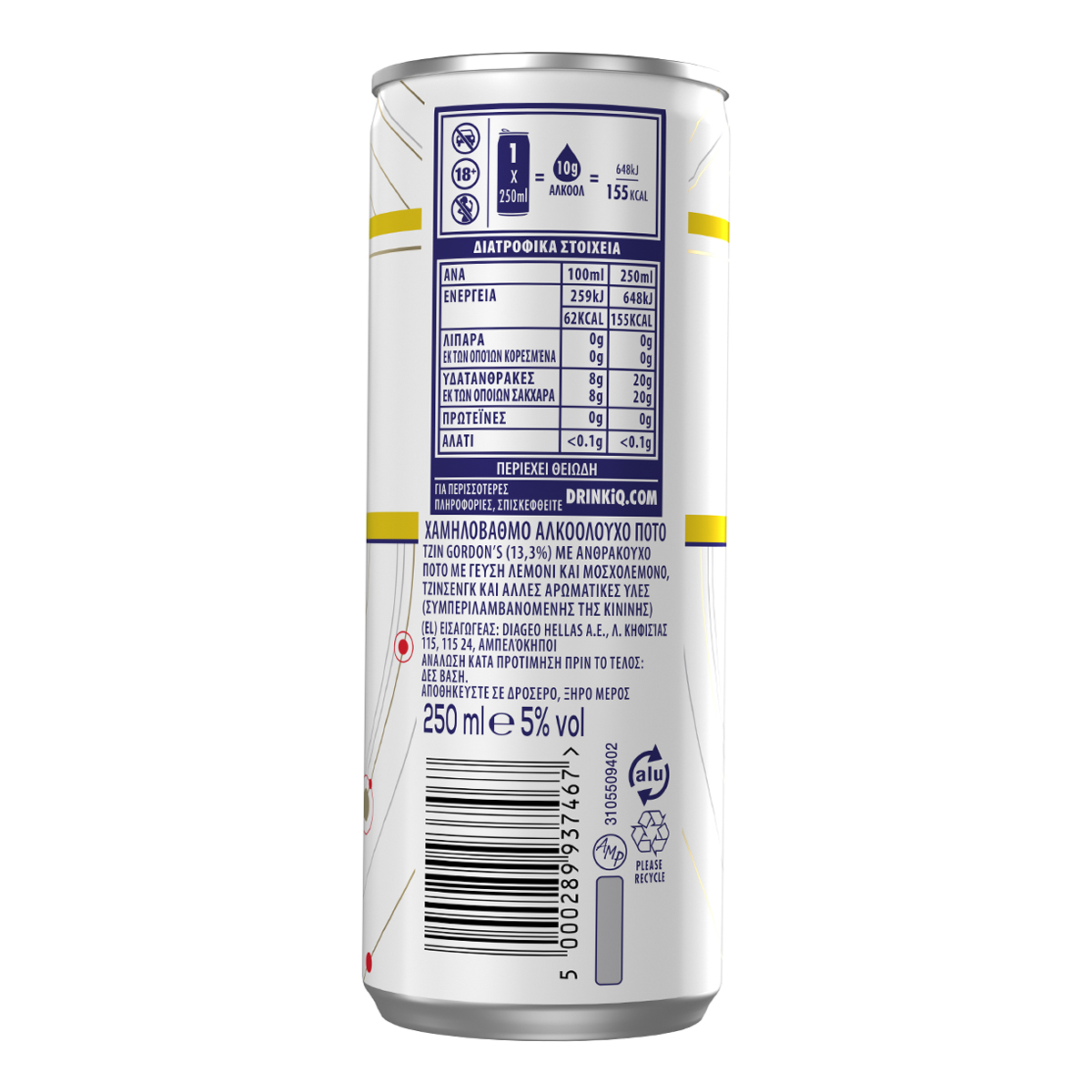 Gordon's Gin (13.3%) with lemon and lime flavoured carbonated drink, ginseng and other flavourings (including quinine).