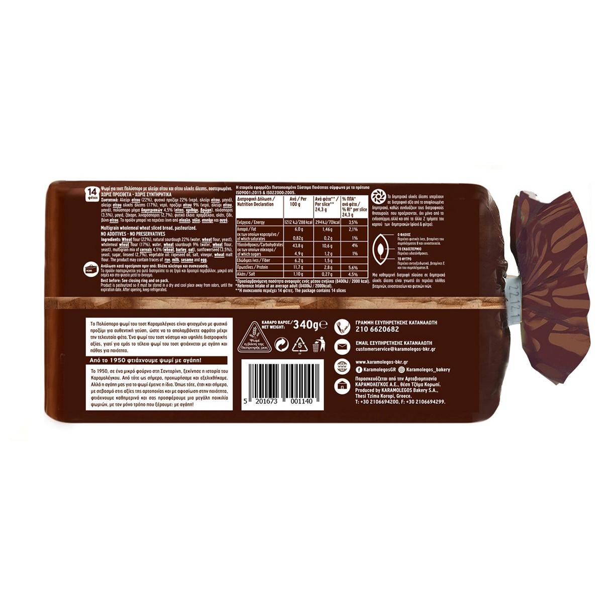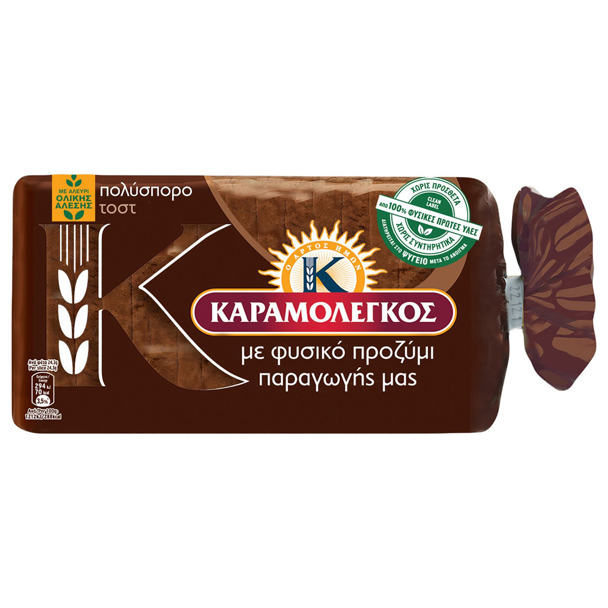To your favorite Karamolegos Toast Bread we added whole wheat flour and seeds for a complete taste and nutritional experience. Made with our all-natural sourdough for a rich and authentic flavor, it remains delicious and fluffy from the first slice to the last. A Clean Label bread, without additives and preservatives, with 100% natural ingredients.