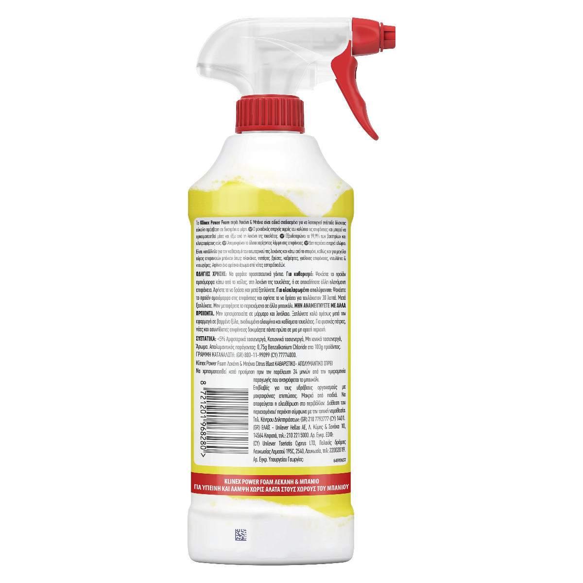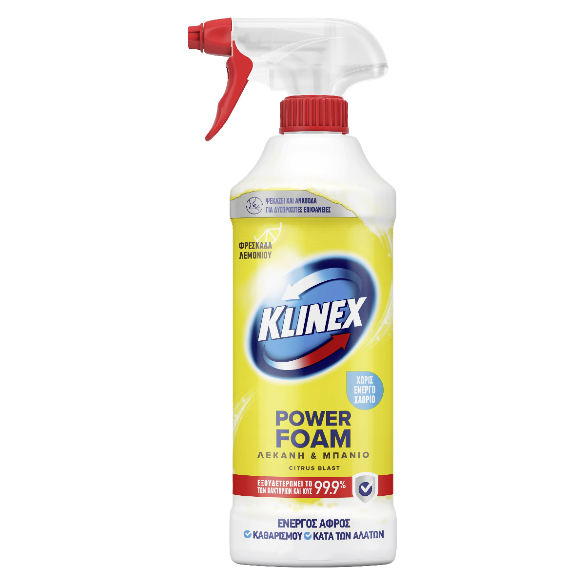 Το Klinex Power Foam σπρέι Λεκάνη & Μπάνιο είναι ειδικά σχεδιασμένο για να λειτουργεί ανάποδα δίνοντας εύκολη πρόσβαση σε δυσπρόσιτα μέρη. Ο μοναδικός ενεργός αφρός του καλύπτει τις επιφάνειες και μπορει να χρησιμοποιηθεί μέσα και έξω από τη λεκάνη της τουαλέτας- εξουδετερώνει το 99,9% των βακτηρίων και ελυτροφόρους ιούς- απομακρύνει τα άλατα χαρίζοντας λάμψη στις επιφάνειες- δεν περιέχει ενεργό χλώριο. Είναι κατάλληλο για τον καθαρισμό του εσωτερικού της λεκάνης και κάτω από το στεφάνι, καθώς και για μεγάλο εύρος επιφανειών μπάνιου όπως: πλακάκια, νιπτήρες, βρύσες, καθρέφτες, γυάλινες επιφάνειες, ντουλάπια & ντουζιέρες. Αφήνει ένα άρωμα φρεσκάδας λεμονιού.