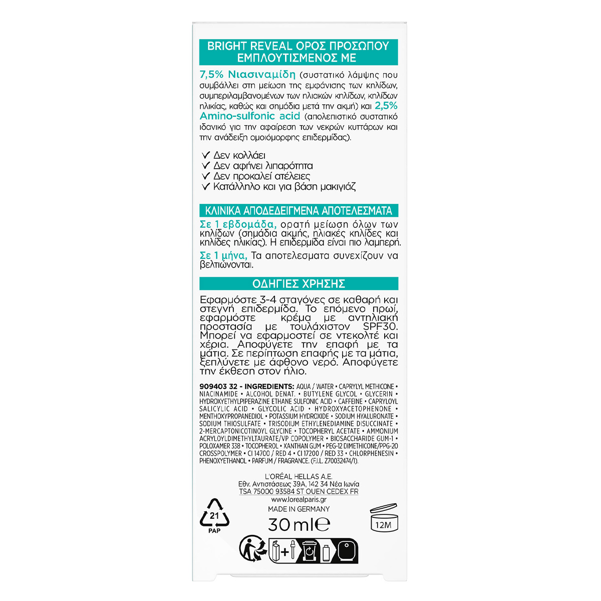 Ολοκληρώστε την ρουτίνα περιποίησης σας κατά των σκούρων κηλίδων με το Bright Reveal Gel καθαρισμού προσώπου, την Bright Reveal καθημερινή κρέμα προσώπου με SPF χωρίς χρώμα ή με χρώμα & το απολεπιστικό Bright Reveal Peeling προσώπου με Νιασιναμίδη.