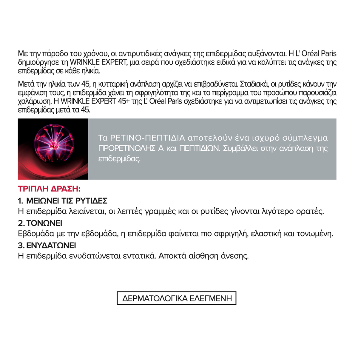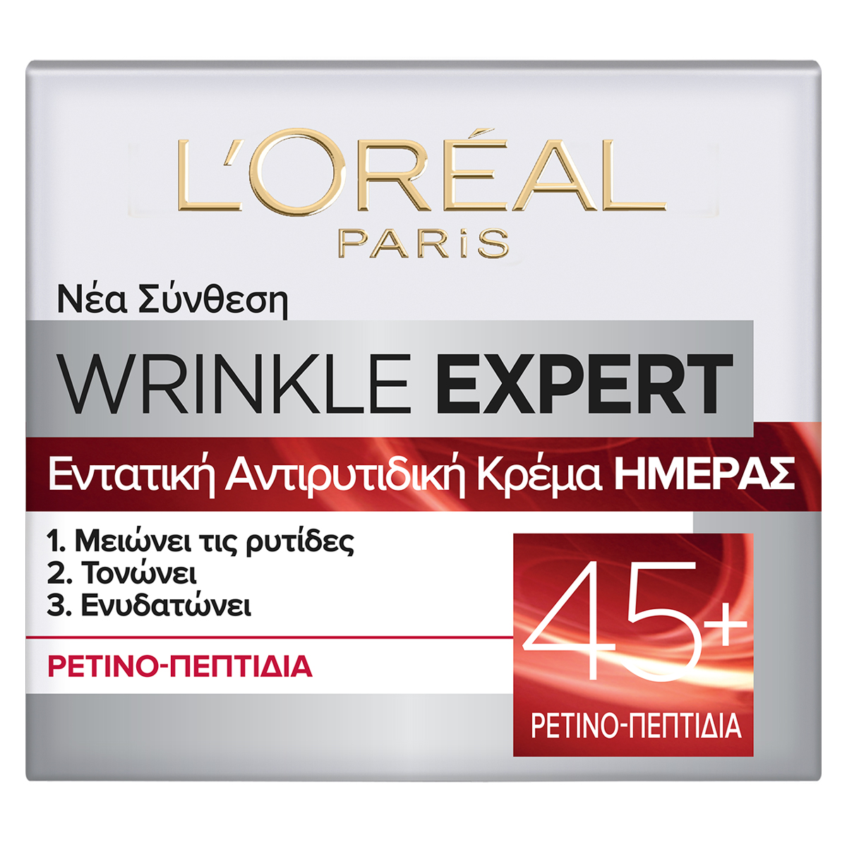 Wrinkle Expert 45+ Intensive Anti-Aging Face Cream Day Cream by L'Oreal Paris. Reduces wrinkles, tones and hydrates the skin. Enriched with retino-peptides, a powerful complex of proretinol A & peptides that helps to regenerate the skin. Over time, the skin's anti-wrinkle needs increase. L'Oreal Paris has created Wrinkle Expert, a range specifically designed to meet the needs of skin at any age. After the age of 45 , cellular regeneration begins and slows down. Gradually wrinkles make their appearance, the skin loses its firmness and the facial contours show sagging. Wrinkle Expert 45+ is suitable to fight these first signs of ageing with its triple action: 1: The skin is smoothed , fine lines and wrinkles become less visible. 2. The wrinkles are noticeable and less wrinkles are reduced: Week after week, the skin looks more toned, supple and firm. 3. Moisturizes: The skin is intensively hydrated. The skin is intensely moisturized. Clinically proven results in 4 weeks: Wrinkles are reduced for 85% of women, skin is tightened for 96% of women and skin looks more hydrated for 94% of women.