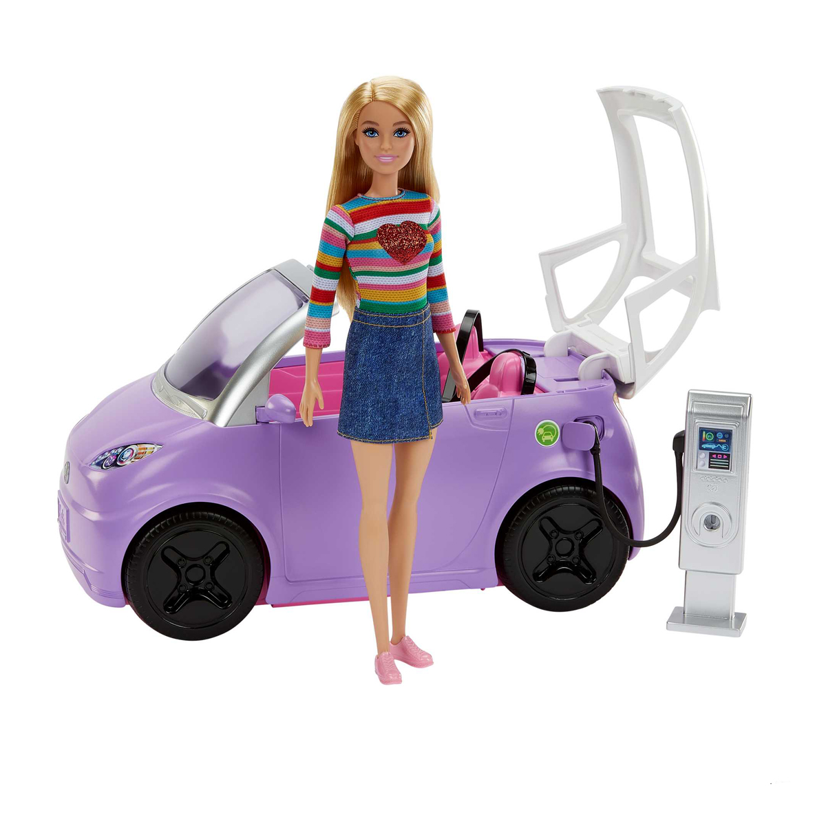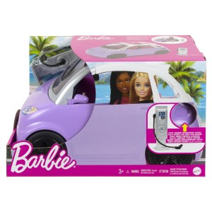Barbie's 'electric car' easily converts into a convertible! Kids simply remove the top and instantly have an open top! Plug in the included 'charging station' to continue the journey. The car doesn't move on its own. Dolls are not included. Colours and designs may vary.
