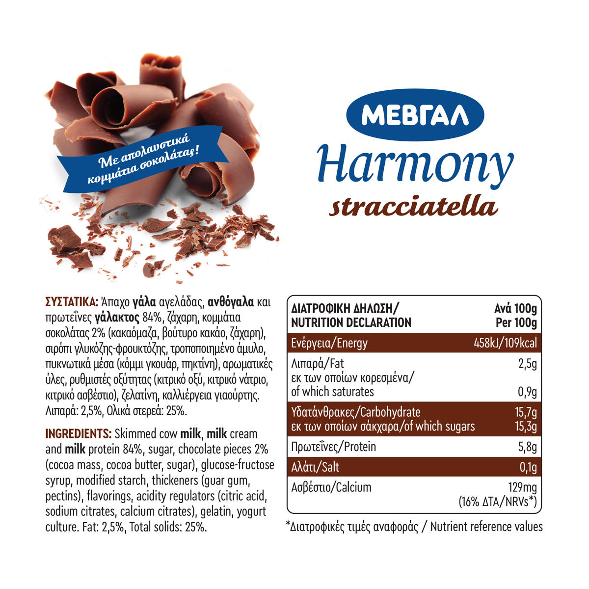 HARMONY yoghurt dessert with only 1% fat and 168 calories (per 200 gr piece), with vanilla syrup, chocolate chips and its rich taste will become an integral part of your healthy diet.
