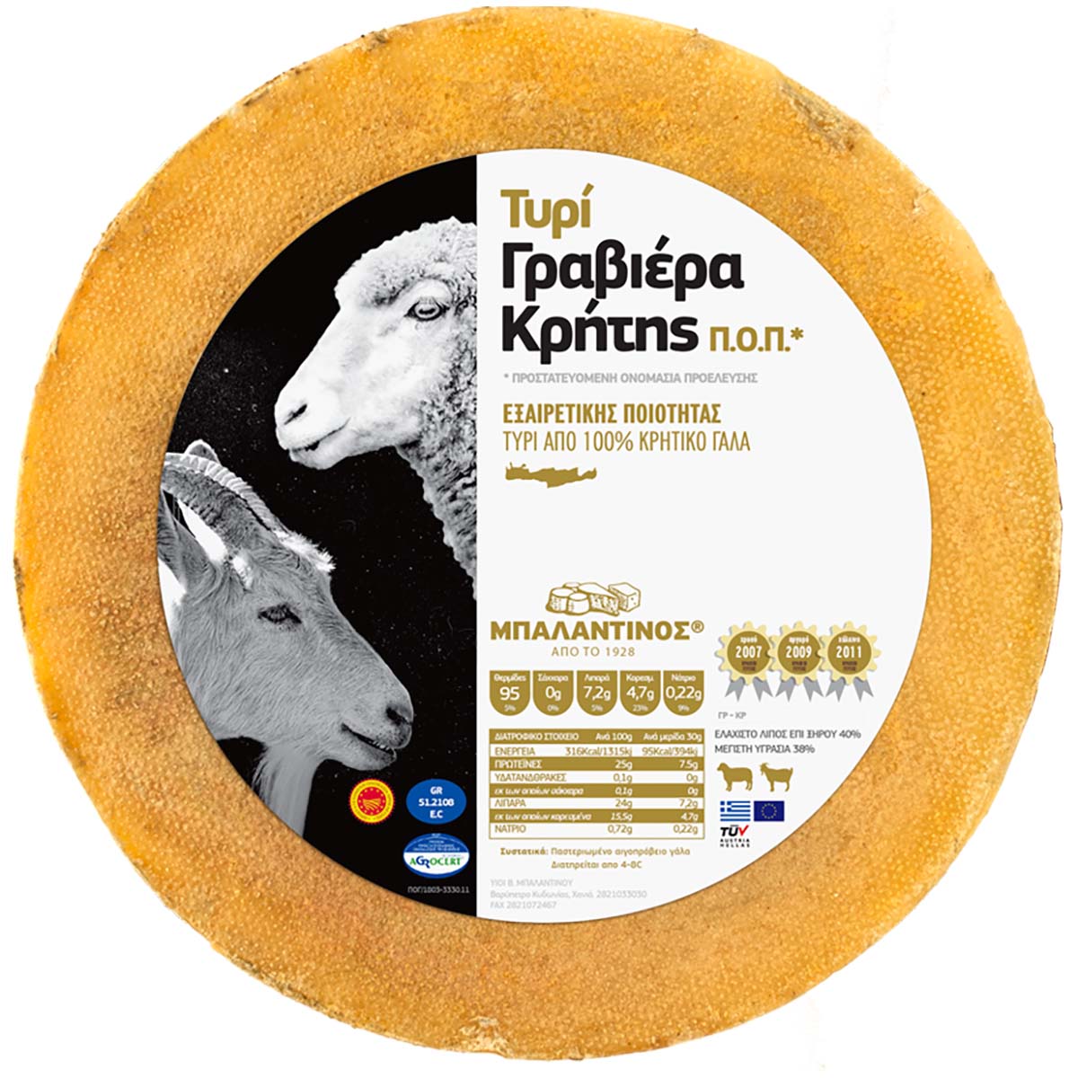 Cretan Gruyere is a hard cheese, with a maximum moisture content of 38 %, a minimum fat content in the dry environment of 40 % and a maximum salt content of 2 %. It is an excellent table cheese with a pleasantly subtle sweet taste and a rich aroma.