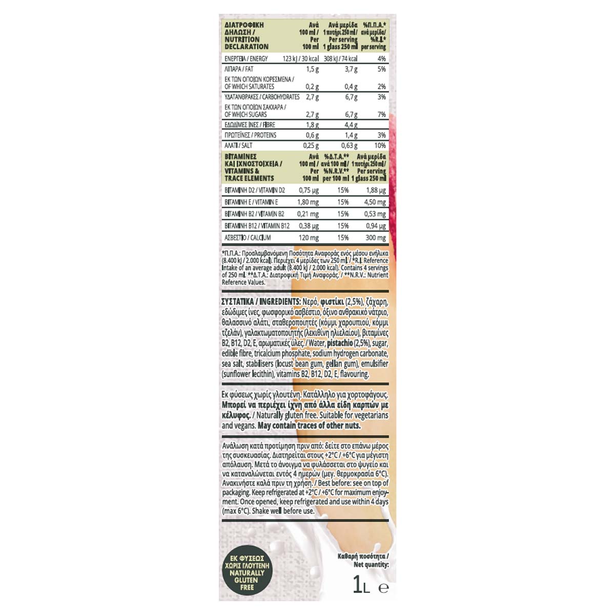 Νερό, φιστίκι (2,5%), ζάχαρη, εδώδιμες ίνες, φωσφορικό ασβέστιο, όξινο ανθρακικό νάτριο, θαλασσινό αλάτι, σταθεροποιητές (κόμμι χαρουπιού, κόμμι τζελάν), γαλακτωματοποιητής (λεκιθίνη ηλιελαίου), βιταμίνες Β2, Β12, D2, Ε, αρωματικές ύλες.