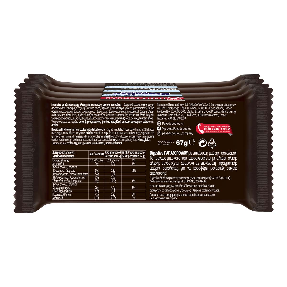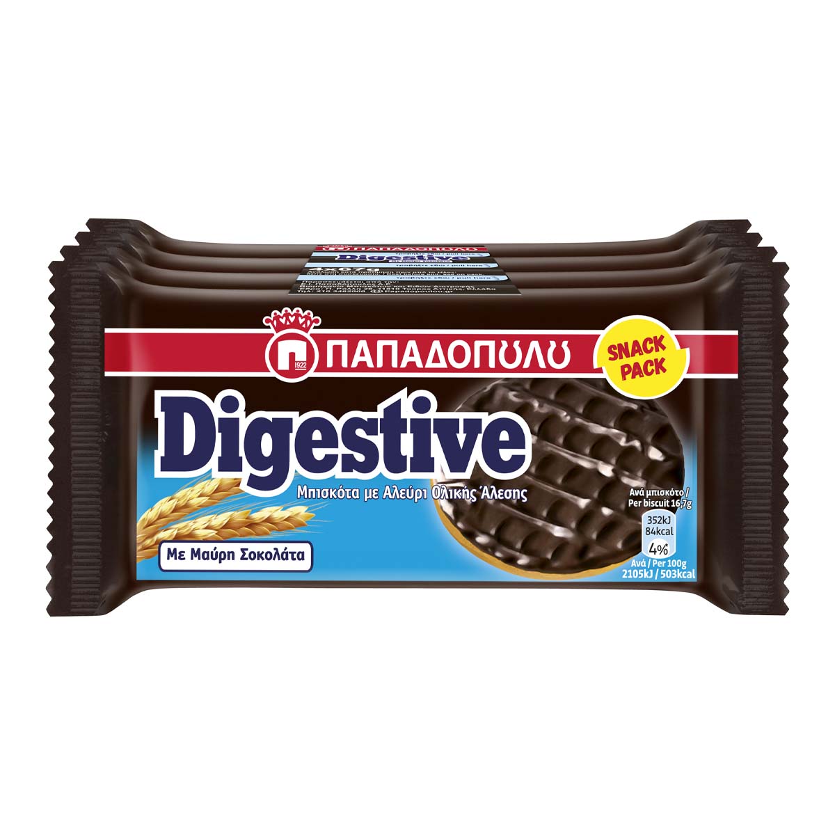 Digestive με μαύρη σοκολάτα, συνδυάζει τη θρεπτική αξία του μπισκότου Digestive με απολαυστική επικάλυψη μαύρης σοκολάτας. Αποτελεί πηγή φυτικών ινών και περιέχει δημητριακά ολική άλεσης.
