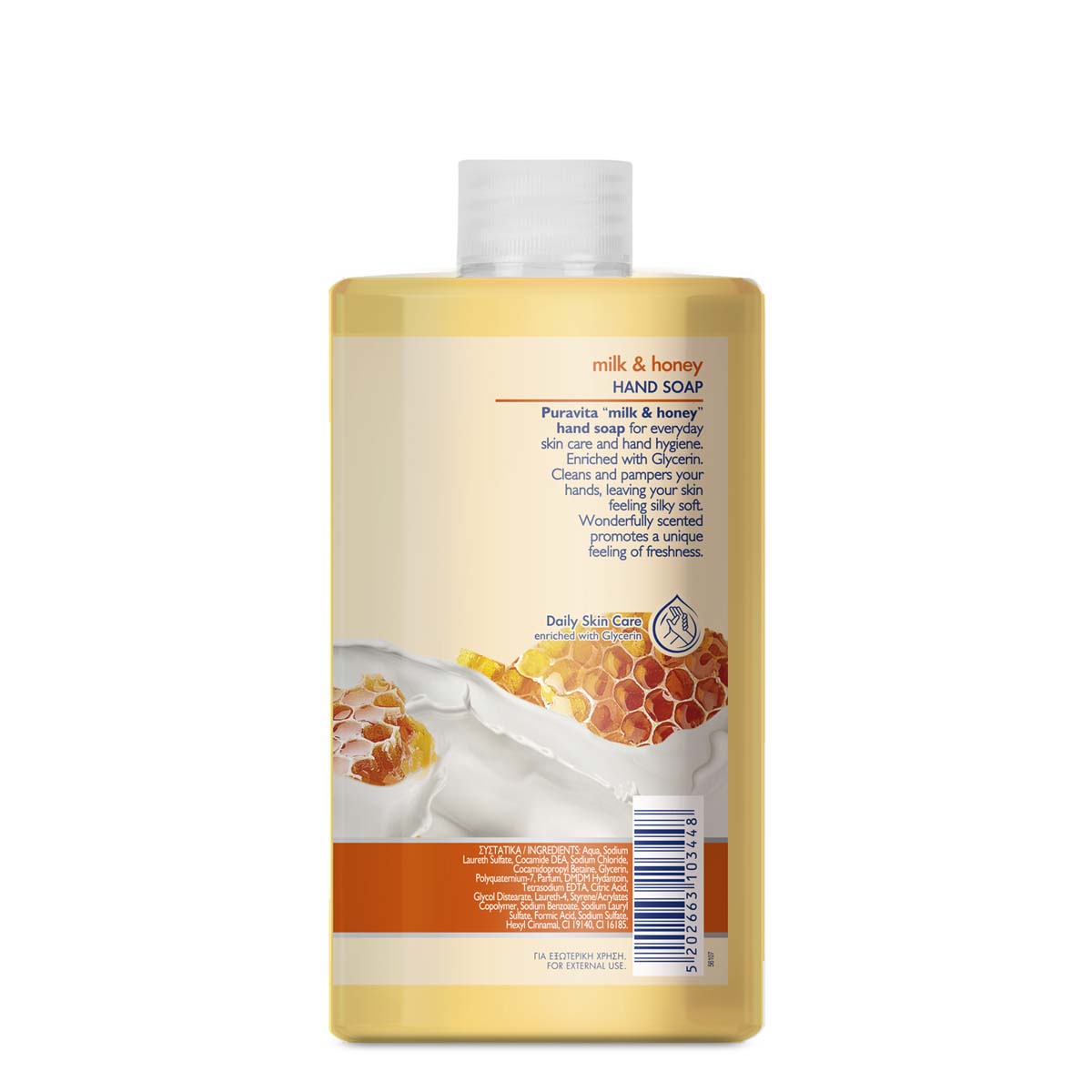 Cleanliness and daily care of your hands with the liquid cream soap Puravita "honey & milk. Its creamy formula is enriched with Glycerin. It effectively cleanses and cares for the hands, giving the skin a unique softness. With a wonderful fragrance for a feeling of freshness.