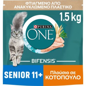 Η PURINA ONE® Senior 11+ είναι μια διατροφή ειδικά σχεδιασμένη ώστε να καλύπτει τις συγκεκριμένες ανάγκες που έχουν οι γάτες ηλικίας 11 ετών και πάνω.Το ισορροπημένο μικροβίωμα του εντέρου είναι απαραίτητο για την καλή υγεία της γάτας σας.Έχει άμεσο αντίκτυπο στο ανοσοποιητικό τους σύστημα.Το μικροβίωμα είναι ένα οικοσύστημα που περιέχει τρισεκατομμύρια μικροοργανισμούς που ζουν στο έντερο και είναι μοναδικοί σε κάθε γάτα.Η ισορροπία των μικροοργανισμών είναι σημαντική για να έχει θετική επίδραση στην πεπτική υγεία, το ανοσοποιητικό σύστημα και τη γενική ευεξία της γάτας σας.Η PURINA ONE® BIFENSIS® είναι μια διατροφική συνταγή με ωφέλιμα λειτουργικά βακτήρια: Λακτοβάκιλο, ο οποίος είναι επιστημονικά αποδεδειγμένο ότι ενισχύει το ανοσοποιητικό σύστημα της γάτας σας από μέσα προς τα έξω και βοηθά στην προστασία ενός υγιούς μικροβιώματος του εντέρου.Η Purina ONE® BIFENSIS® περιέχει υψηλής ποιότητας συστατικά, συμπεριλαμβανομένου του πρεβιοτικού: σικορέ, το οποίο καλλιεργεί τα καλά βακτήρια στο έντερο για να βελτιώσουν το μικροβίωμα του εντέρου της γάτας σας έτσι ώστε να διατηρήσει η γάτα σας την καλή υγεία.Τα ορατά αποτελέσματα για την υγεία της γάτας σας σήμερα και αύριο μπορείτε να τα δείτε από μια υγιή πέψη και ένα ισχυρό ανοσοποιητικό σύστημα έως ένα λαμπερό τρίχωμα.