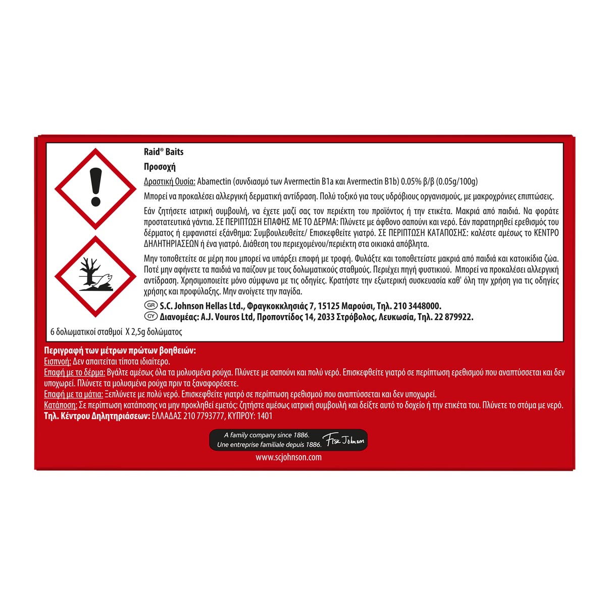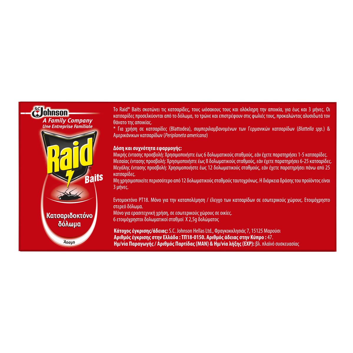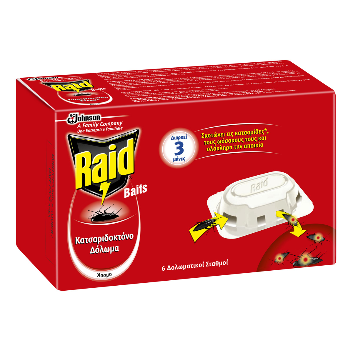 Raid® Baits kills cockroaches, their egg sacs and the entire colony, for up to 3 months. Cockroaches are attracted to the bait, eat it and return to their nests, causing a chain reaction of colony death.
