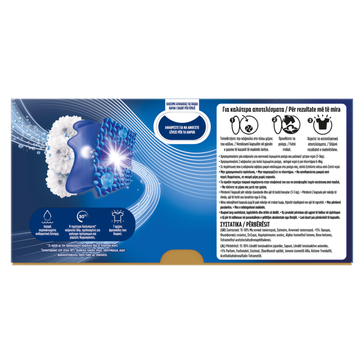 Ισχυρή συμπυκνωμένη καθαριστική δύναμηΗ ταχύτερα διαλυόμενη* κάψουλα Skip, σχεδιασμένη για σύντομο πρόγραμμα και χαμηλές θερμοκρασίες.7 ημέρες φρεσκάδας που διαρκεί.* Σε σχέση με την προηγούμενη κάψουλα Skip σε πλαστικό κουτί.