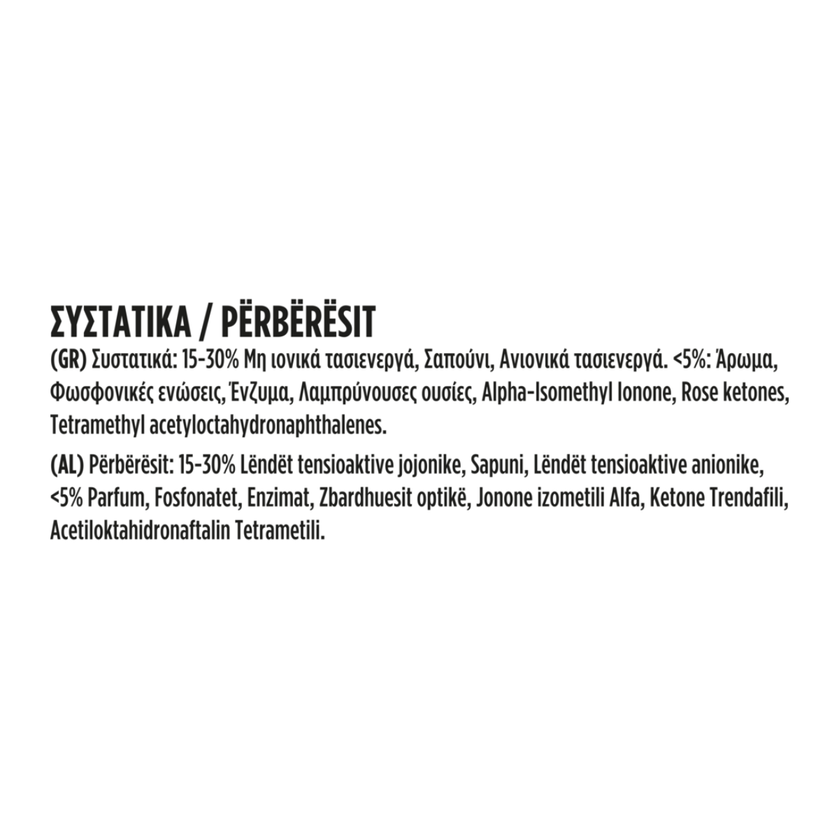 15-30% Μη ιονικά τασιενεργά, Σαπούνι, Ανιονικά τασιενεργά. <5%: Άρωμα, Φωσφονικές ενώσεις, Ένζυμα, Λαμπρύνουσες ουσίες, Alpha-Isomethyl Ionone, Rose ketones, Tetramethyl acetyloctahydronaphthalenes.