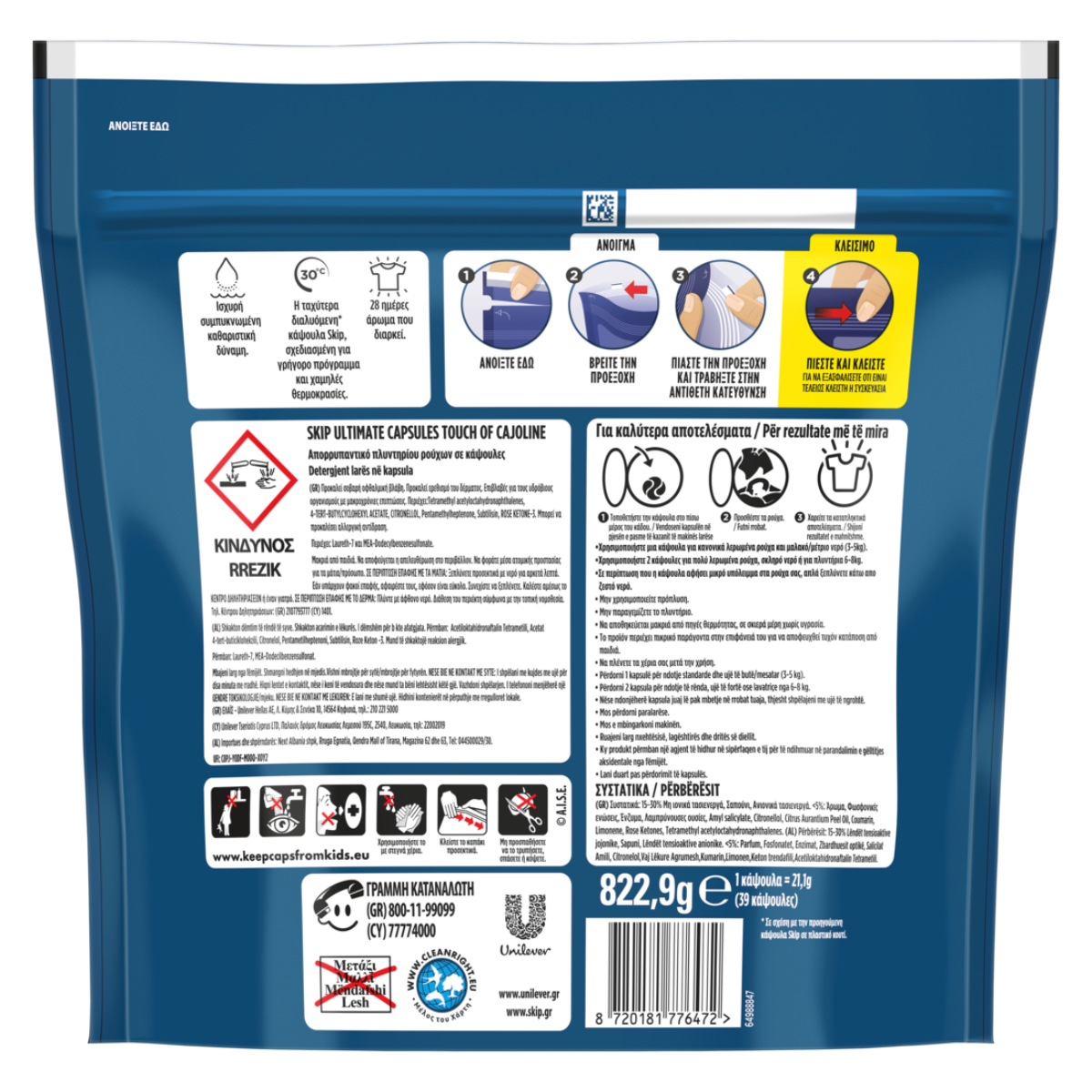 Ισχυρή συμπυκνωμένη καθαριστική δύναμηΗ ταχύτερα διαλυόμενη* κάψουλα Skip, σχεδιασμένη για σύντομο πρόγραμμα και χαμηλές θερμοκρασίες.28 ημέρες άρωμα που διαρκεί.* Σε σχέση με την προηγούμενη κάψουλα Skip σε πλαστικό κουτί.
