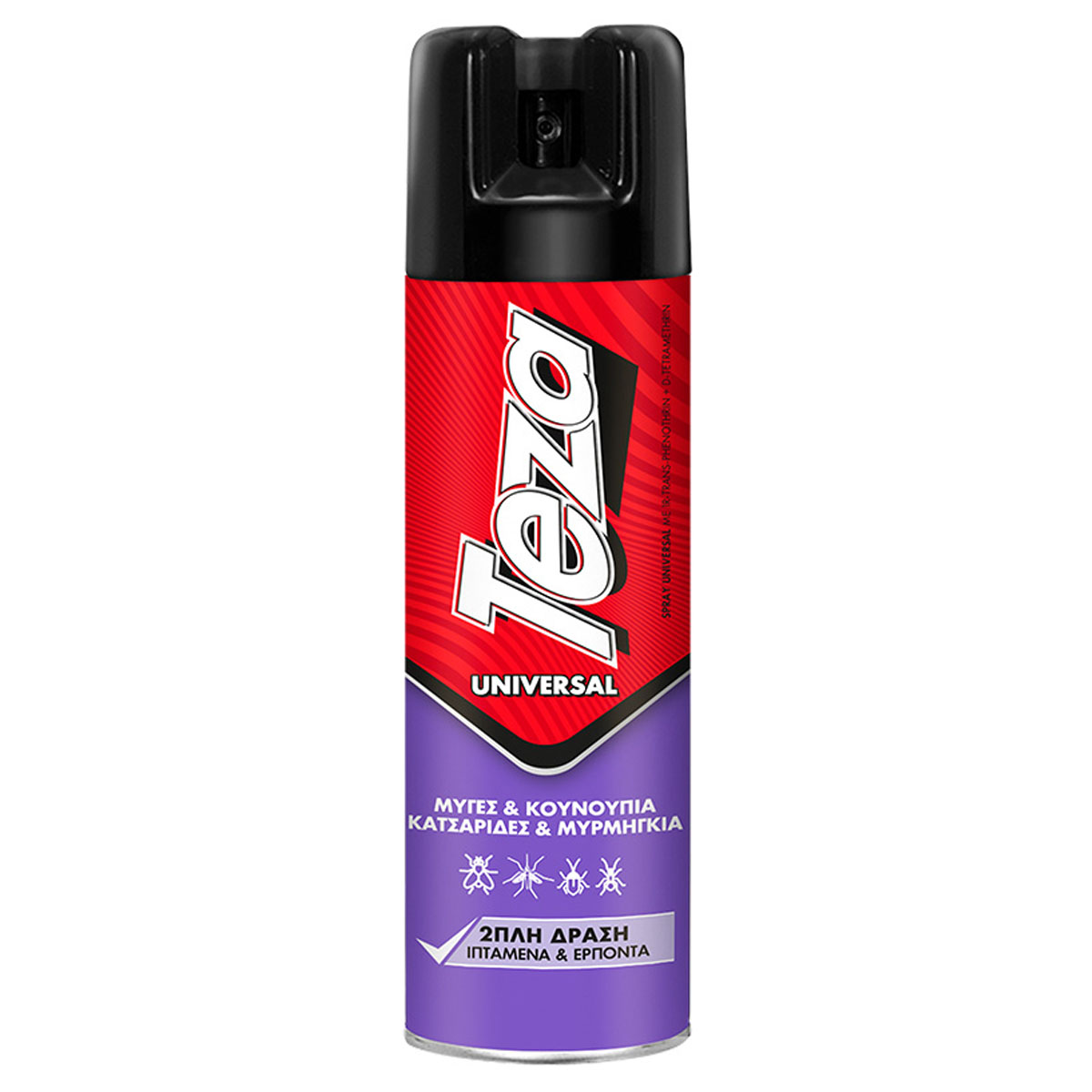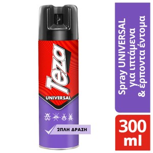 TEZA UNIVERSAL SPRAY has a double action as it fights flying and crawling insects. It eliminates flies, mosquitoes, gnats, cockroaches, ants, bugs, ticks, spiders, fish, fleas and moths. Special valve allows you to spray in low or narrow and awkward places by holding the can upside down.