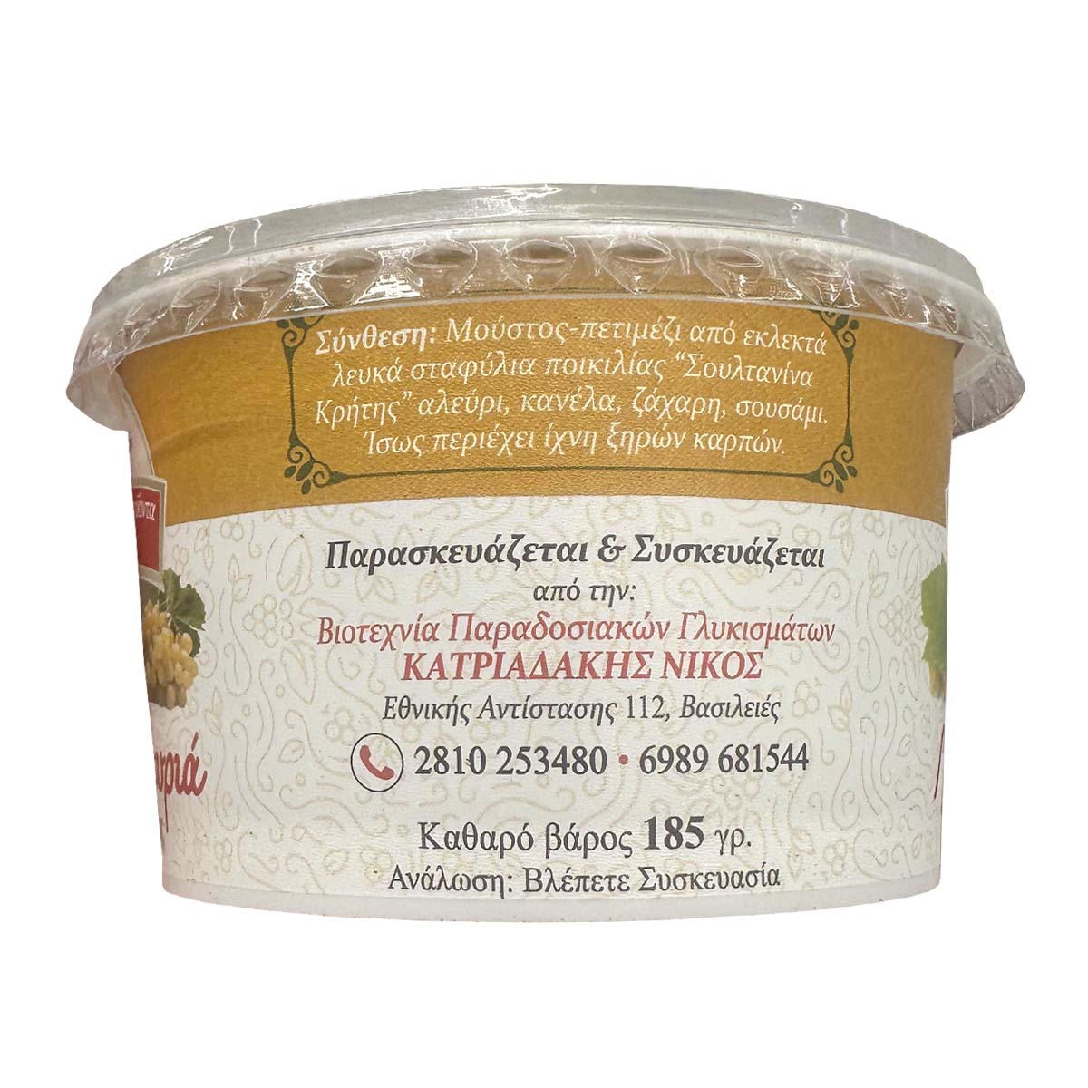 Produced & Packaged by: KATRADAKIS NIKOS Traditional Confectionery Workshop, 112 Ethnikis Antistaseos St., Vasileies, Tel: 2810 253480 - 6989 681544