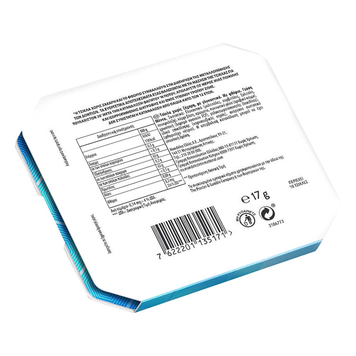 Sweeteners (maltitol, sorbitol, sorbitol, xylitol, sucralose), gum base, flavourings, thickener (gum arabic), colouring agent (bright cyan FCF), emulsifier (lecithins), coating material (carnauba wax), inorganic ingredient (sodium fluoride).