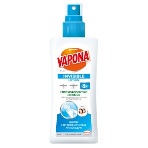 Vapona Invisible Lotion is an unscented body insect repellent that provides up to 8 hours of protection against mosquitoes (including the "tiger" mosquito), flies, and ticks. Features: Body insect repellent. Protects against mosquitoes (including the "tiger" mosquito), flies, and ticks. Odorless, dries quickly, and does not stain. Dermatologically tested. Offers up to 8 hours of protection!