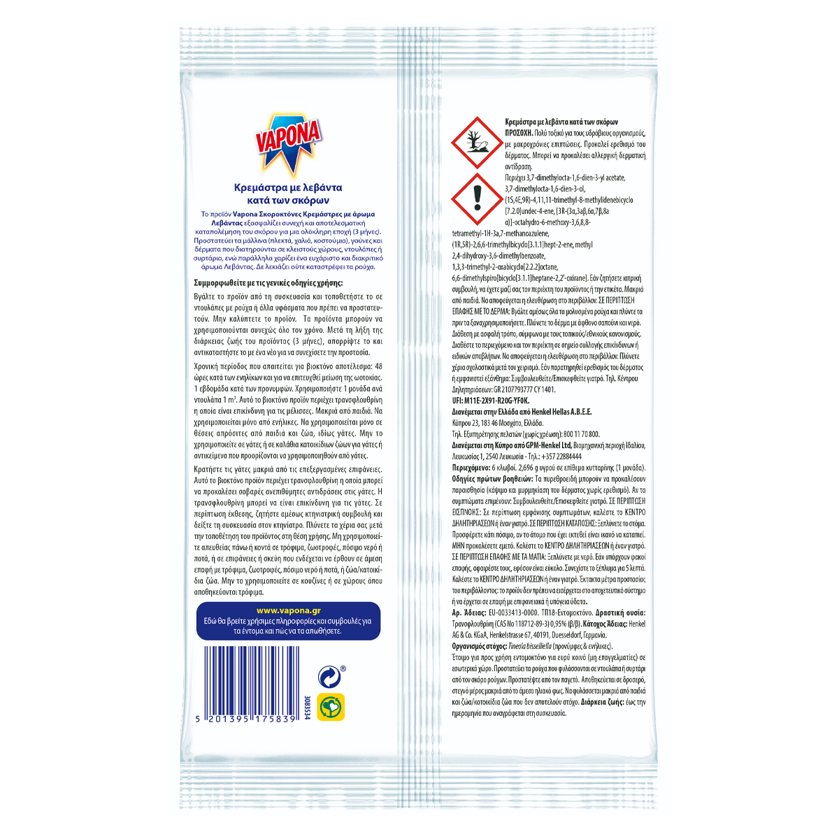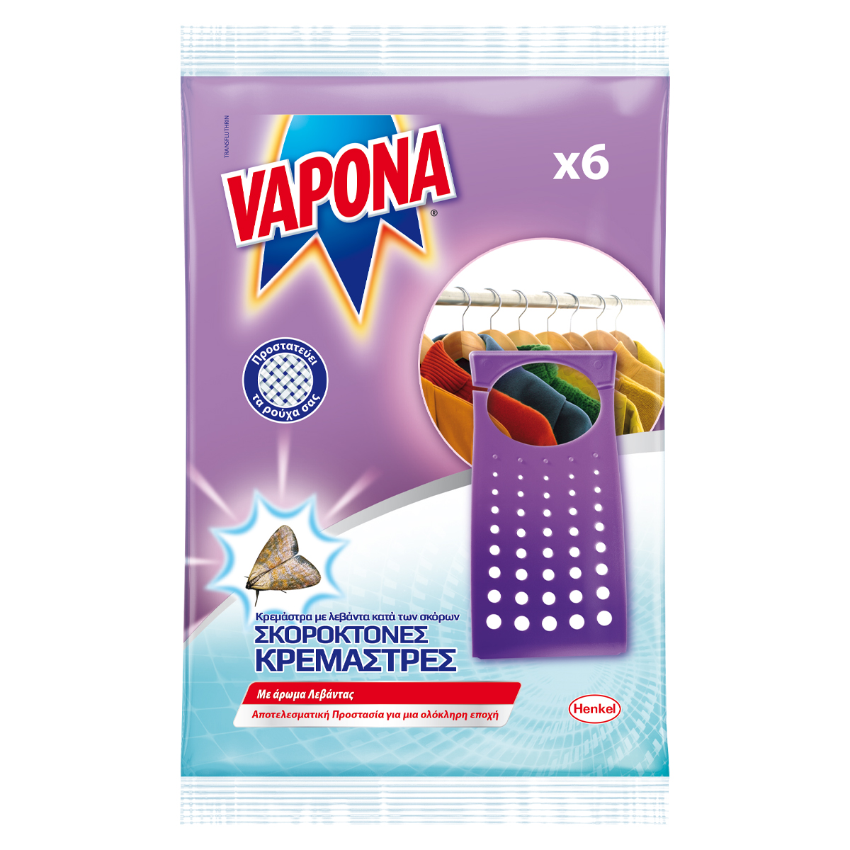 Vapona Moth Repellent Hangers with lavender scent are the perfect solution for protecting your closet from moths. They offer a practical solution that ensures continuous and effective moth control for the entire season (3 months). Protects woolen items (knits, rugs, suits), furs, and leathers stored in enclosed spaces, closets, and drawers. Can be used year-round, especially during the summer months. It does not stain clothes.