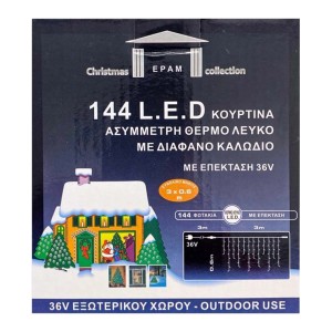 Λαμπάκια 144 LED Θερμό Λευκό Φωτάκια Κουρτίνα Ασύμμετρη Με Διάφανο καλώδιο & Επέκταση 36V Εξωτερικού Χώρου 3 m