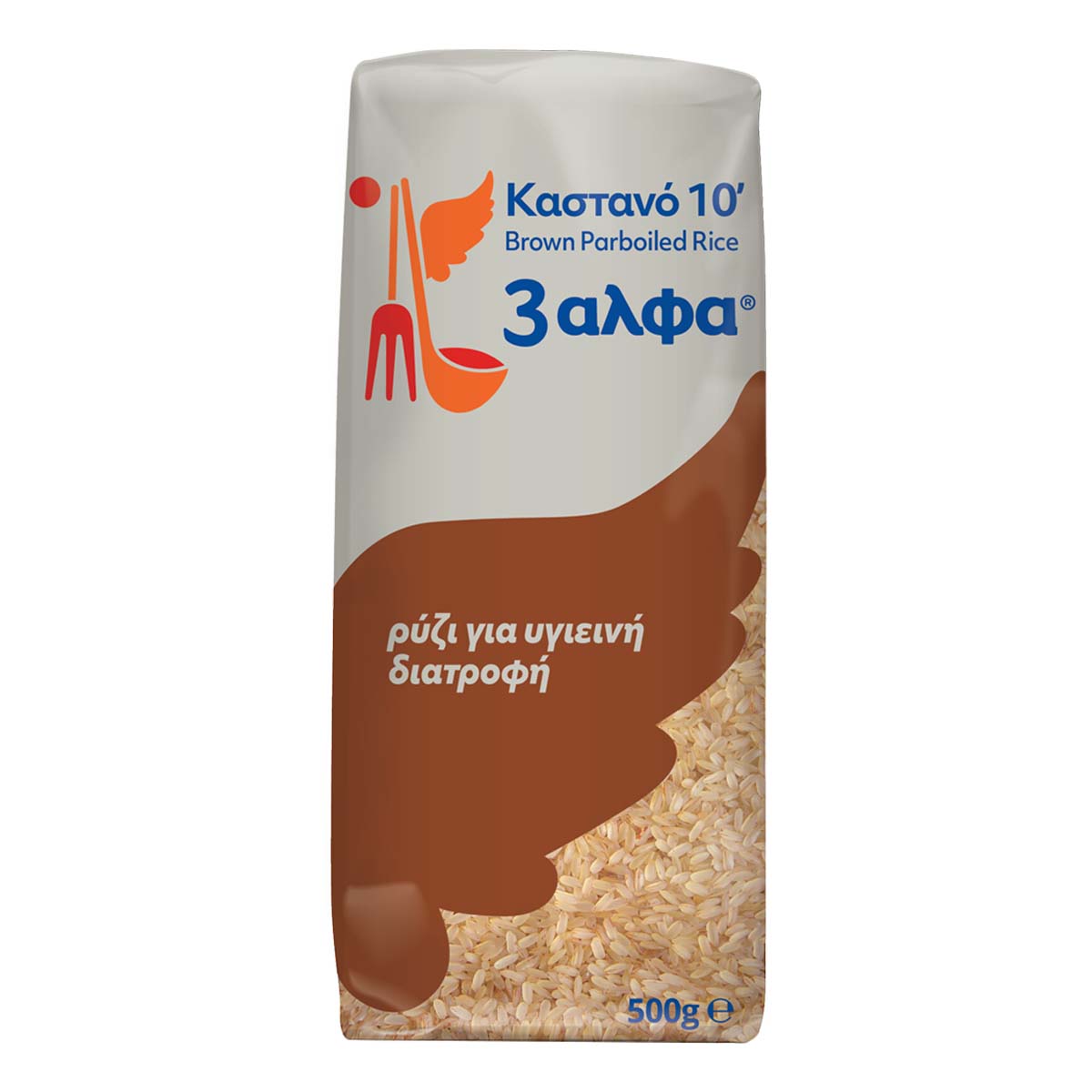 Το 3αλφα Καστανό 10’ ρύζι προέρχεται από κόκκους μακρύσπερμου ρυζιού στους οποίους διατηρούνται άθικτα το ενδοσπέρμιο, η φύτρα και το πίτουρο, με αποτέλεσμα την υψηλή θρεπτική αξία του. Έχει χαμηλή περιεκτικότητα σε λιπαρά, δεν περιέχει σάκχαρα και αλάτι, ενώ είναι πηγή μαγγανίου, φωσφόρου και μαγνησίου. Η φυσική επεξεργασία με βραστό νερό (υγροθερμική -parboiling), συγκρατεί στο εσωτερικό των κόκκων του όλα τα πολύτιμα συστατικά τους και το βοηθά να βράζει σε μόνο 10’.Ιδανικό για όσους ακολουθούν μια υγιεινή διατροφή, που μπορούν να το απολαύσουν σε σαλάτες, ρυζόγαλο και ως συνοδευτικό σε κυρίως πιάτα.