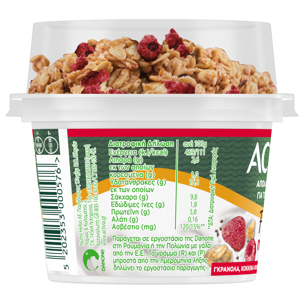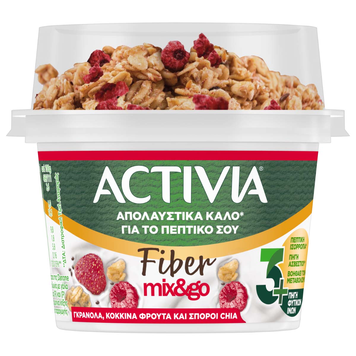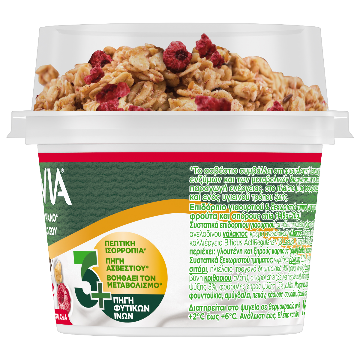 Επιδόρπιο γιαουρτιού & ξεχωριστό τμήμα με γκρανόλα, κόκκινα φρούτα και σπόρους chia. Ένα θρεπτικό και υγιεινό γεύμα με 4 δις Bifidus Actiregularis, ασβέστιο και φυτικές ίνες που συμβάλλουν στη φυσιολογική λειτουργία του πεπτικού συστήματος. Με λεπτόρρευστη υφή για εύκολη ανάμειξη με το μείγμα από γκρανόλα και κόκκινα φρούτα στο ξεχωριστό καπάκι. Αποτελεί ένα πλήρες γεύμα κατάλληλο για όλες τις ώρες της ημέρας και είναι ιδανικό για όσους επιζητούν ισορροπημένη διατροφή. Η κατανάλωση από παιδιά συνίσταται μετά την ηλικία των 3 ετών.