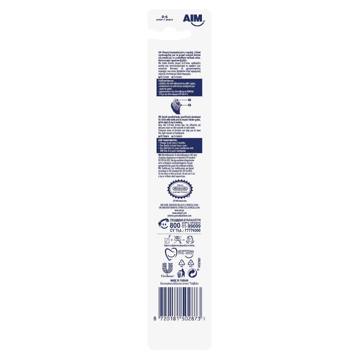 Νεά AIM Kids 0-6 ετών, σχεδιασμένη για τα νεογιλά δοντιά και βάση στήριξης με βεντούζα. Μικρή στρογγυλεμένη κεφαλή. Ειδικά σχεδιασμένη για τα μικρά νεογιλά δόντια και απαλή με τα ευαίσθητα παιδικά ούλα. Με πολύ λεπτές άκρες 0.01mm, καθαρίζει απαλά και αποτελεσματικά το σμάλτο των νεογιλών δοντιών. Οι χρωματισμένες περιοχές των ινών, βοηθούν στην εφαρμογή σωστής ποσότητας οδοντόκρεμας.