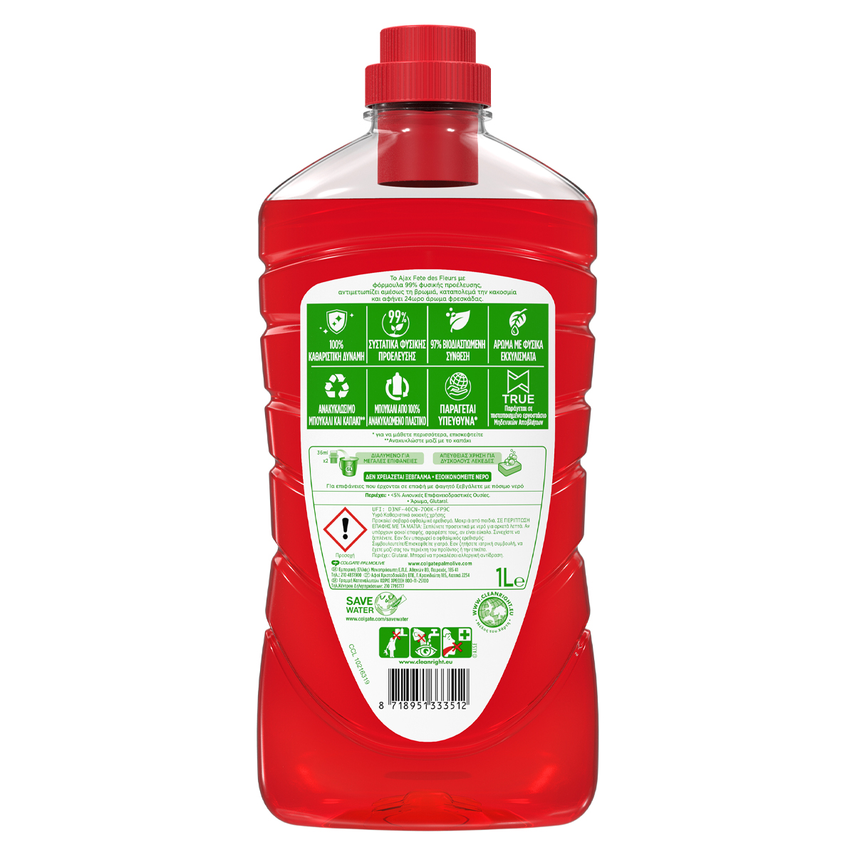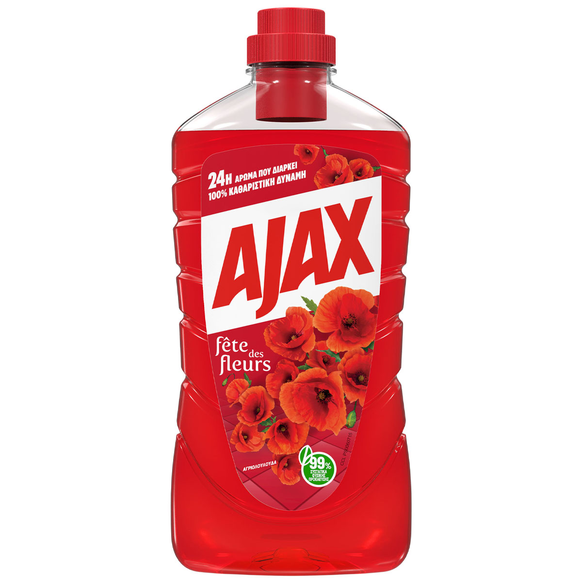 Το Ajax Fete des Fleurs Αγριολούλουδα Υγρό Καθαριστικό Πατώματος προσφέρει έντονο άρωμα φρεσκάδας, που διαρκεί 24 ώρες. Το Ajax πολυκαθαριστικό προσφέρει 100% καθαριστική δύναμη.