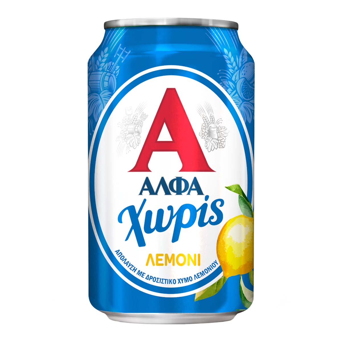 Η νέα Άλφα Χωρίς με λεμόνι είναι μια αναζωογονητική μπύρα χαμηλού αλκοόλ, φτιαγμένη με χυμό από λεμόνια, προσφέροντας ζωντανή, λεμονάτη γεύση και φρουτώδες άρωμα.